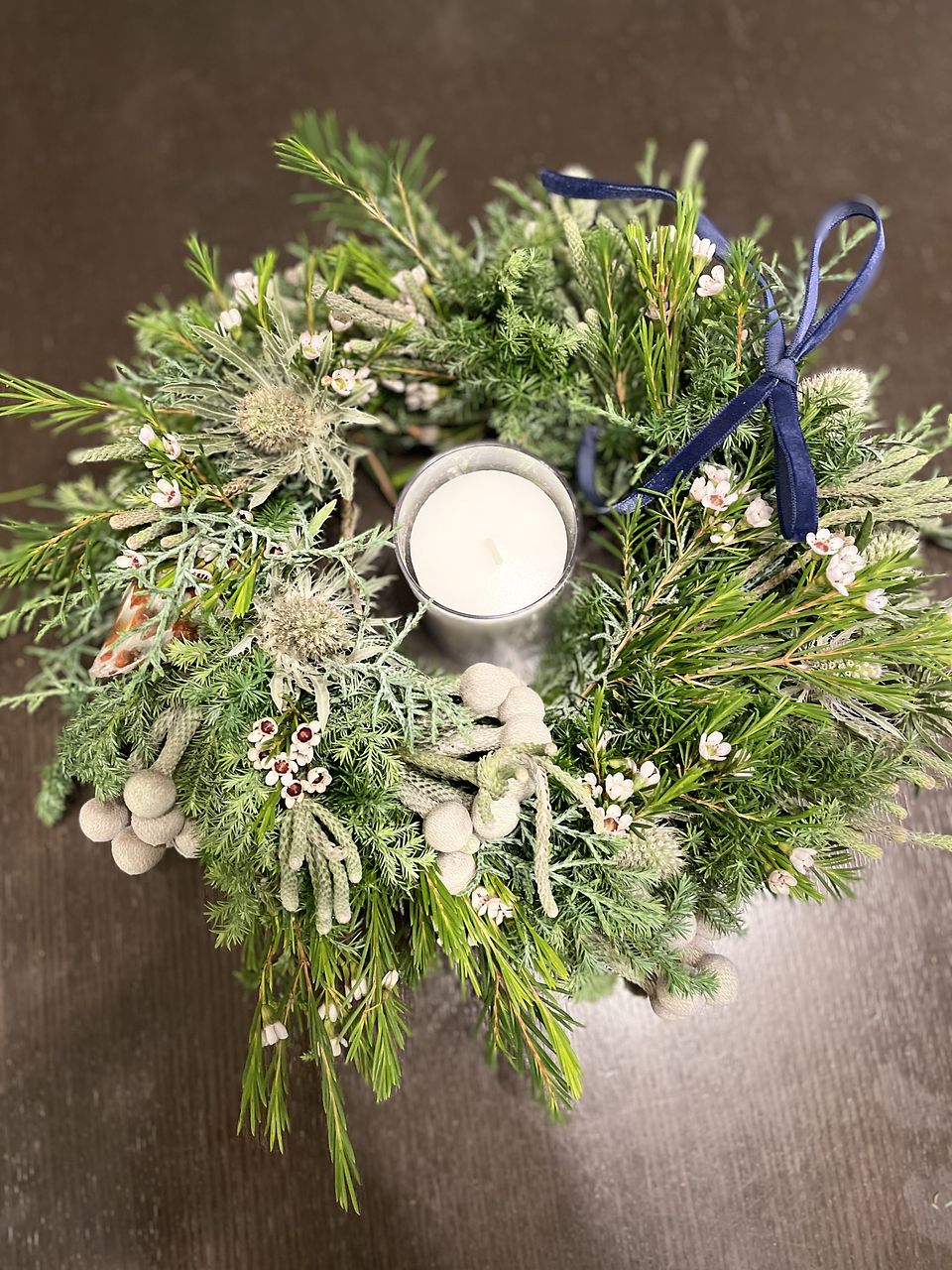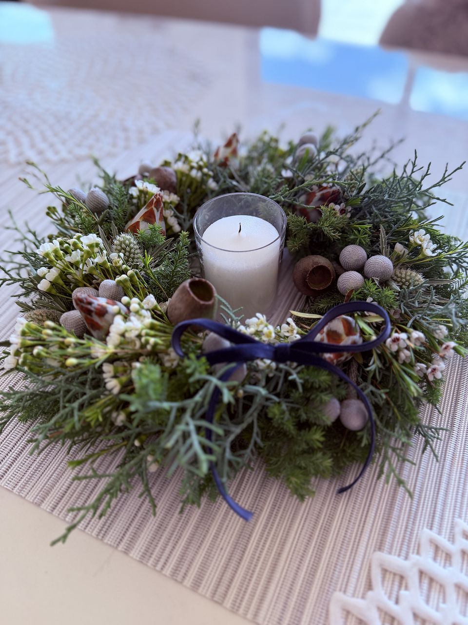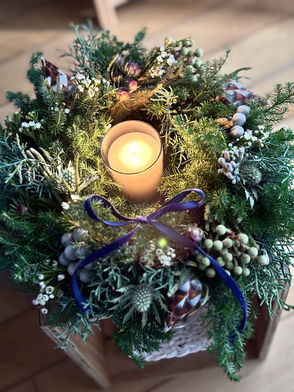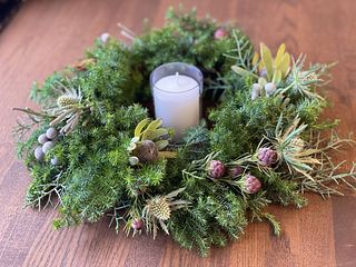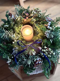 グリーンモリモリ盛り盛りで思い通りのリースができました❣️ 手持ちのキャンドル🕯️もよく合ってムード満点! 癒されます
