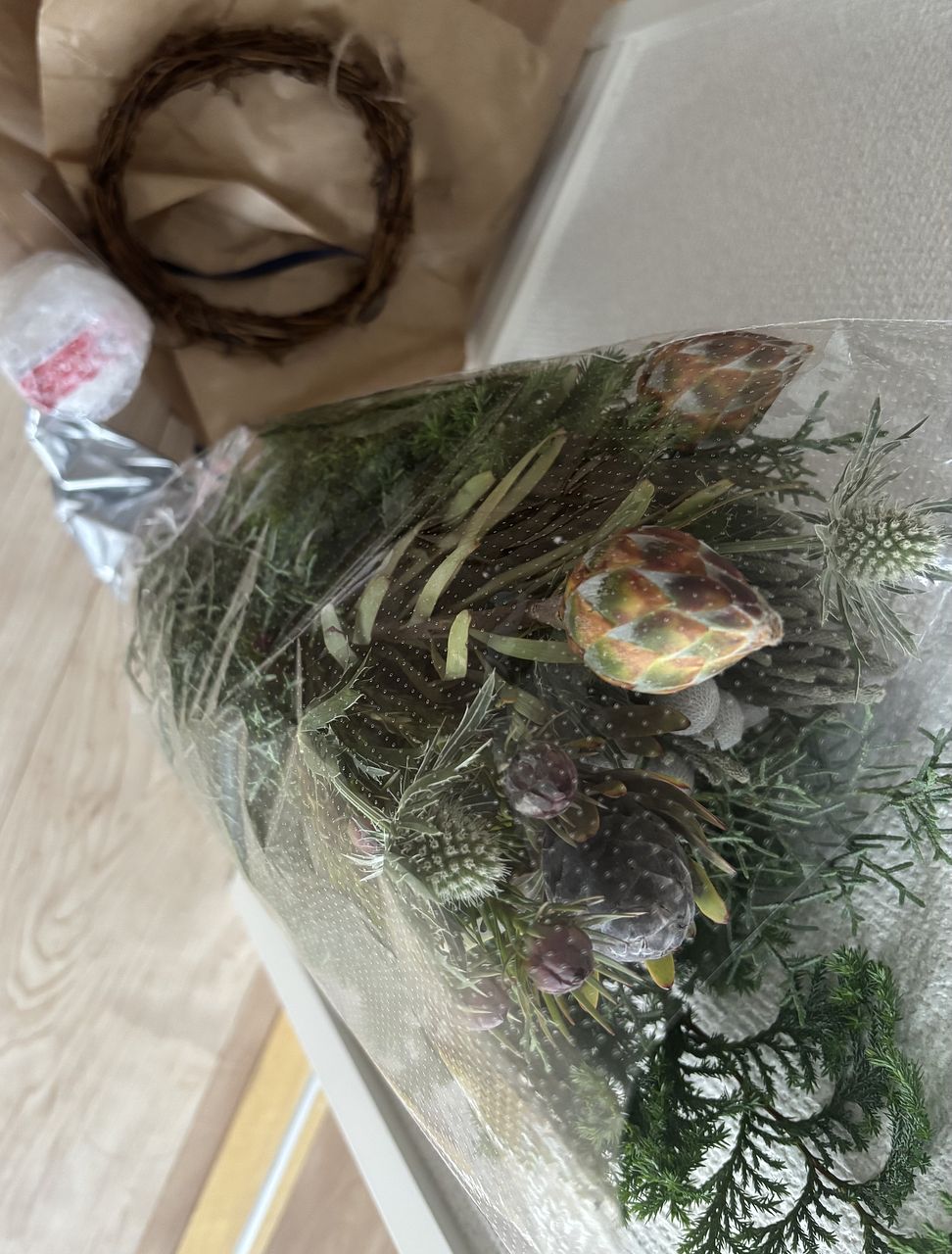 これだけの花材でお安くないですか? もっこもこのリースができて大感激です!
