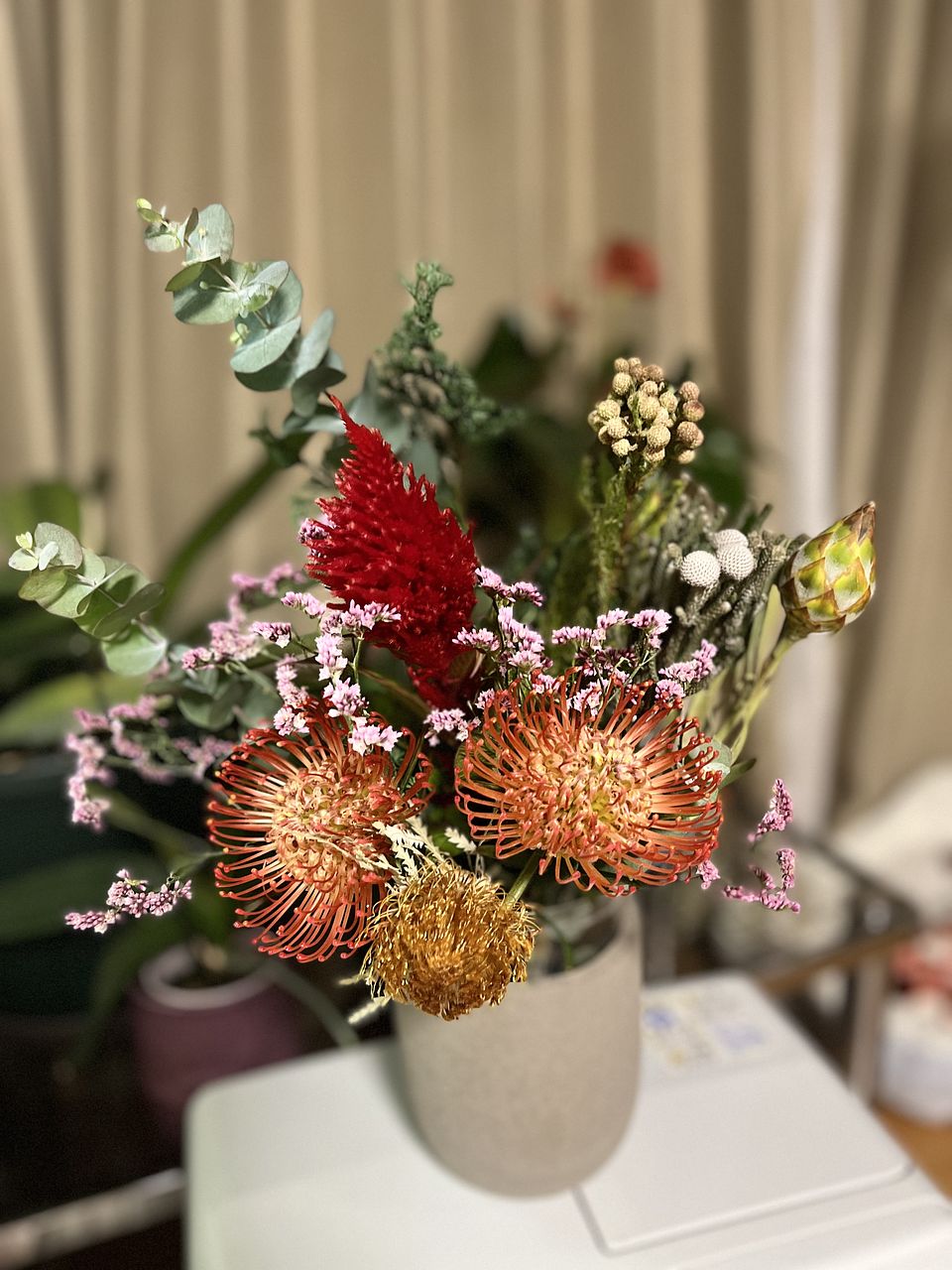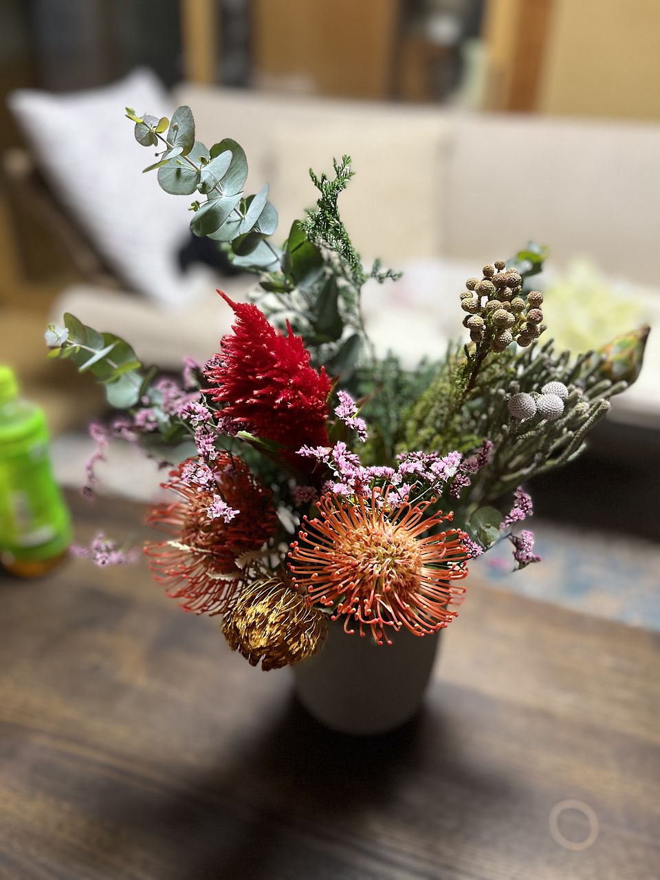 グリーンやピンクの小花がアクセントとなり、自然のぬくもりもたっぷり。お部屋に飾れば、まるで暖炉の火が灯るようなあたたかさで空間を包み込みます😍