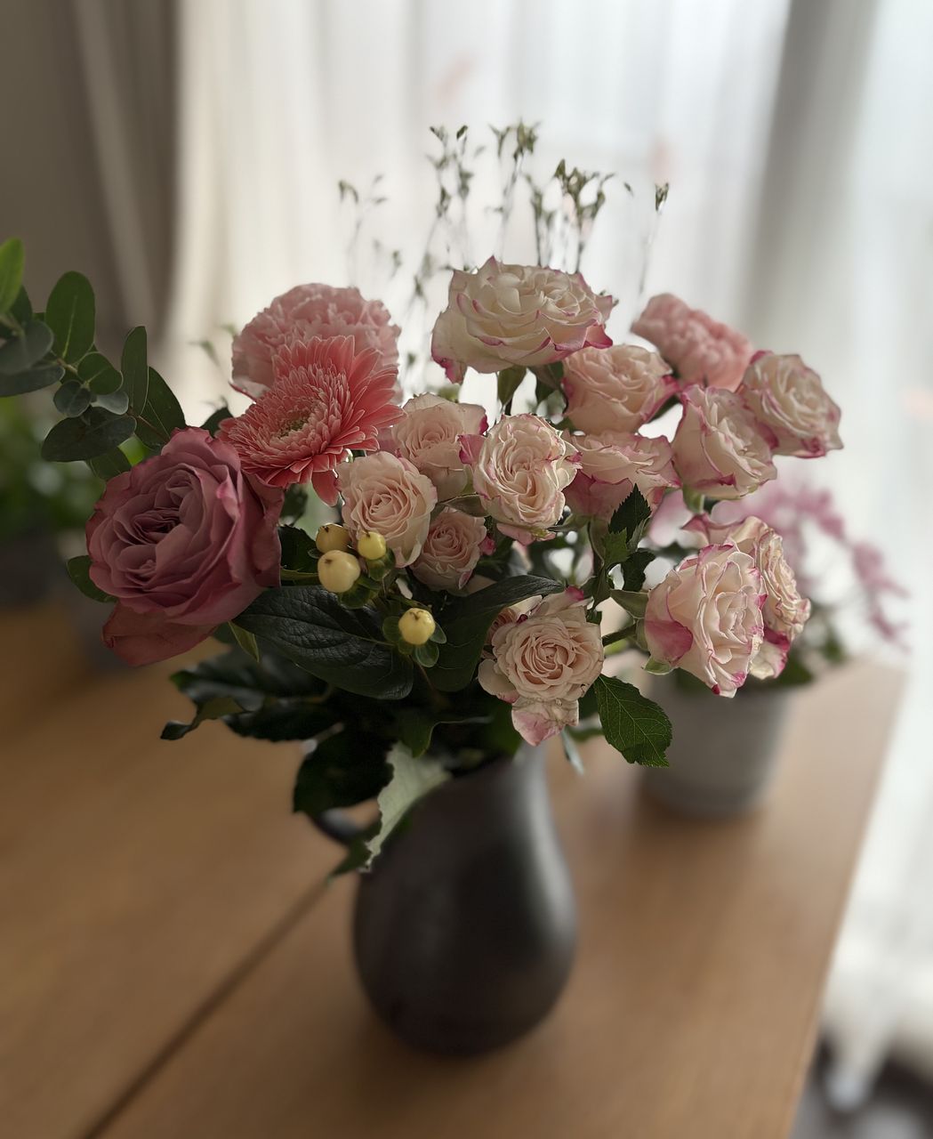 今回はてんびん座のシンボルカラー、ピンクを束ねて♎️淡いピンクのバラや、もこもこガーベラをセレクトしました。