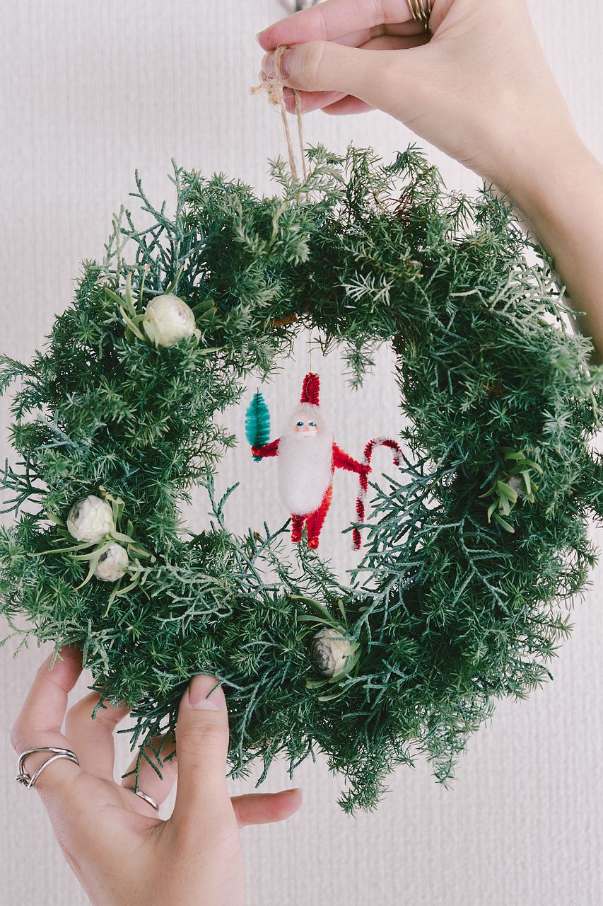今回はサンタさんが主役になるよう、ナチュラルなグリーンのリースに。フレッシュな状態からだんだんとドライになっていくので風合いの変化も楽しめます。