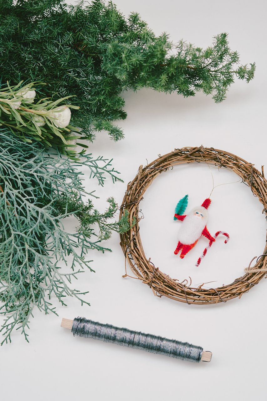 フレッシュリースの素材とモールサンタのセットです。サンタさんの赤が引き立つよう、シンプルなグリーンのリースにしました。お好みで飾りをプラスしても◎