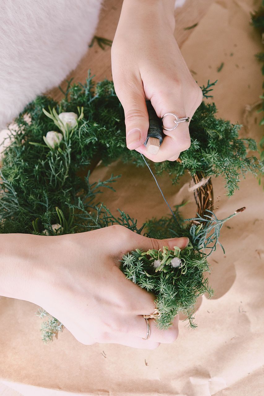 リース作りは意外と簡単。切り分けた花材を土台にワイヤーで固定していくだけ。リースの作り方についての記事がこのページの下部にありますので、そちらもぜひ参考にしてみて!