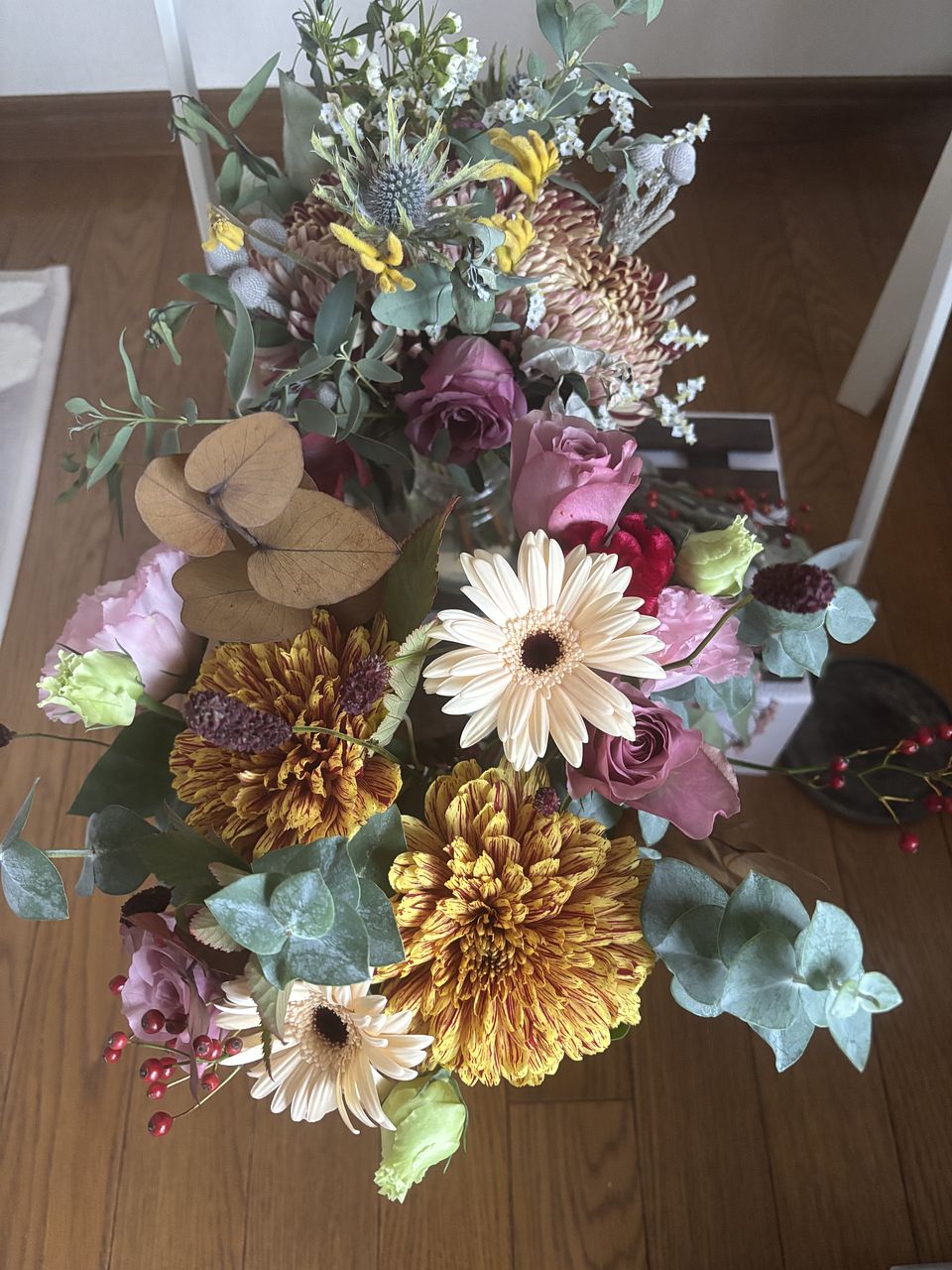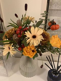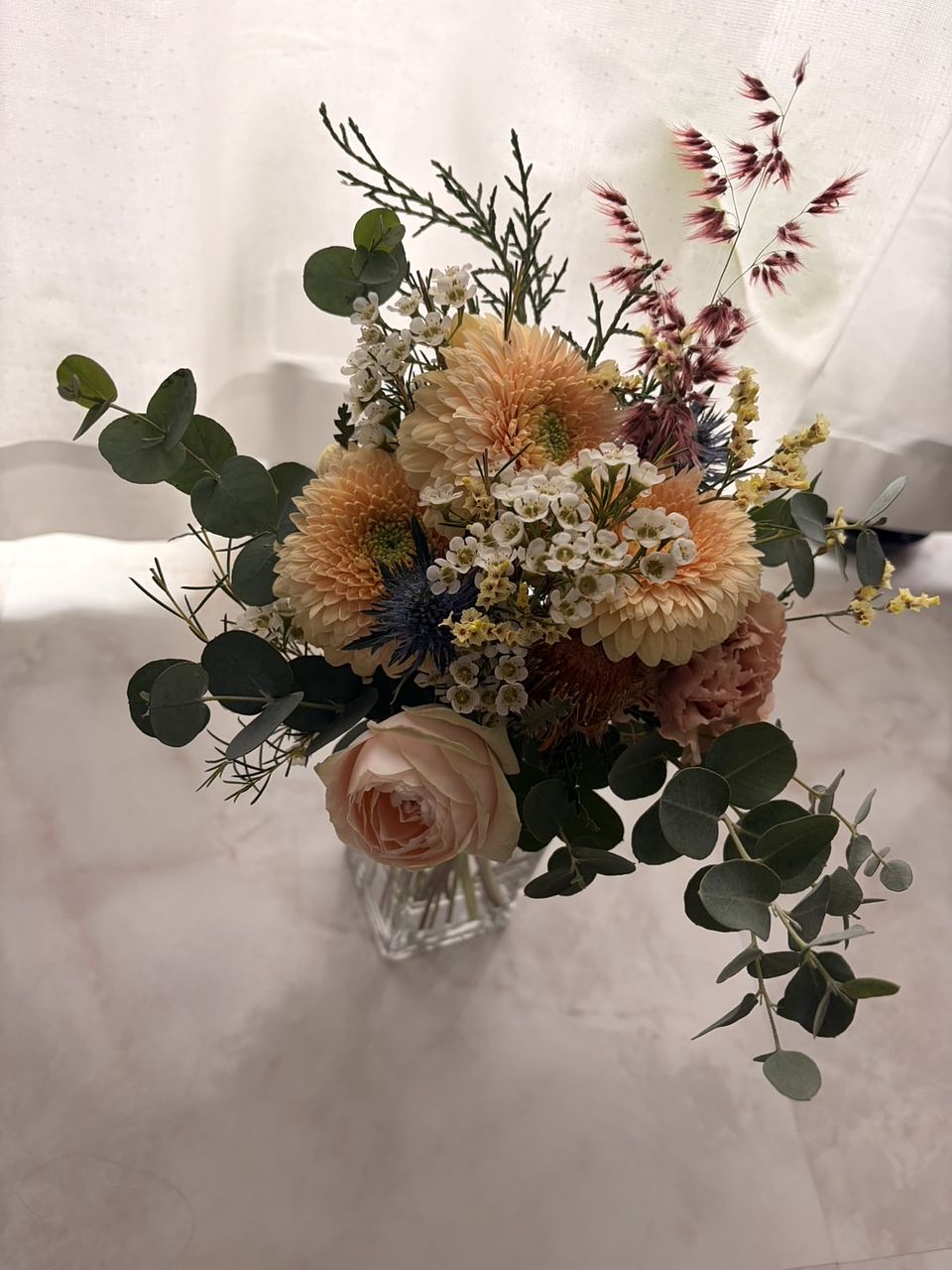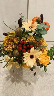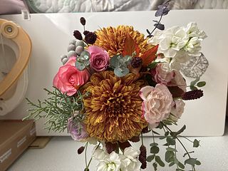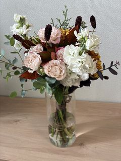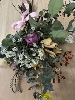 やっと念願のayaさんのブーケを購入でき嬉しい!グリーンの使い方がとても素敵。丸い葉のユーカリなど、普段見る事があまりない花材の組み合わせが素敵。だけど、タイミング的にクールの配送じゃなくなって、心配してたら案の定、まる2日かかりで届いたお花は、小さなお花はパラパラと落ちて、少しカラカラ気味、トルコキキョウや、カーネーション?のピンクのお花は全て薄茶に変色してしまっていました。配送中の、2日間は30度に近い気温だったので、残念でした。なので、こちらの評価になりました。本格的に涼しくなったら、またお願いしたいと思います。