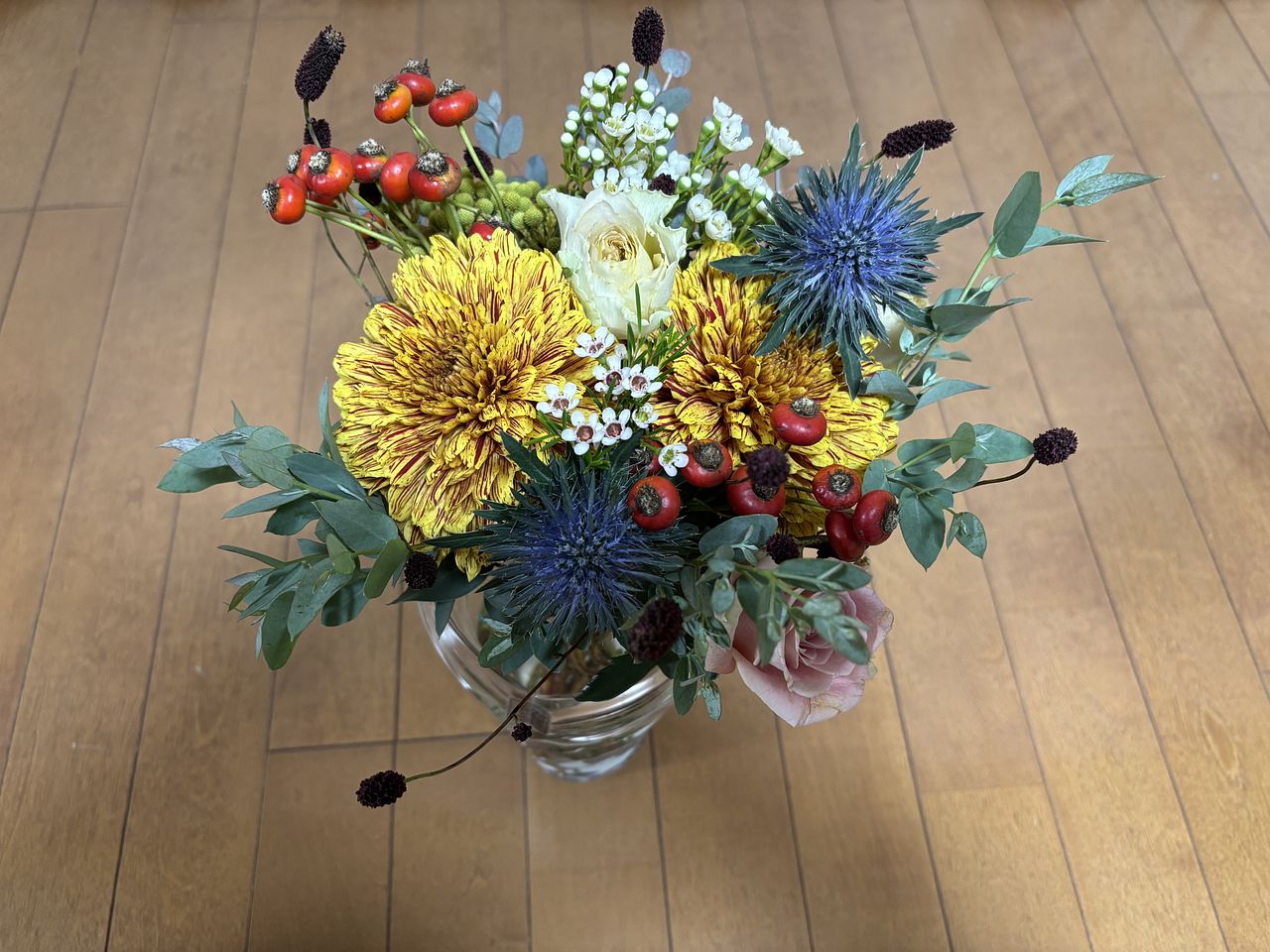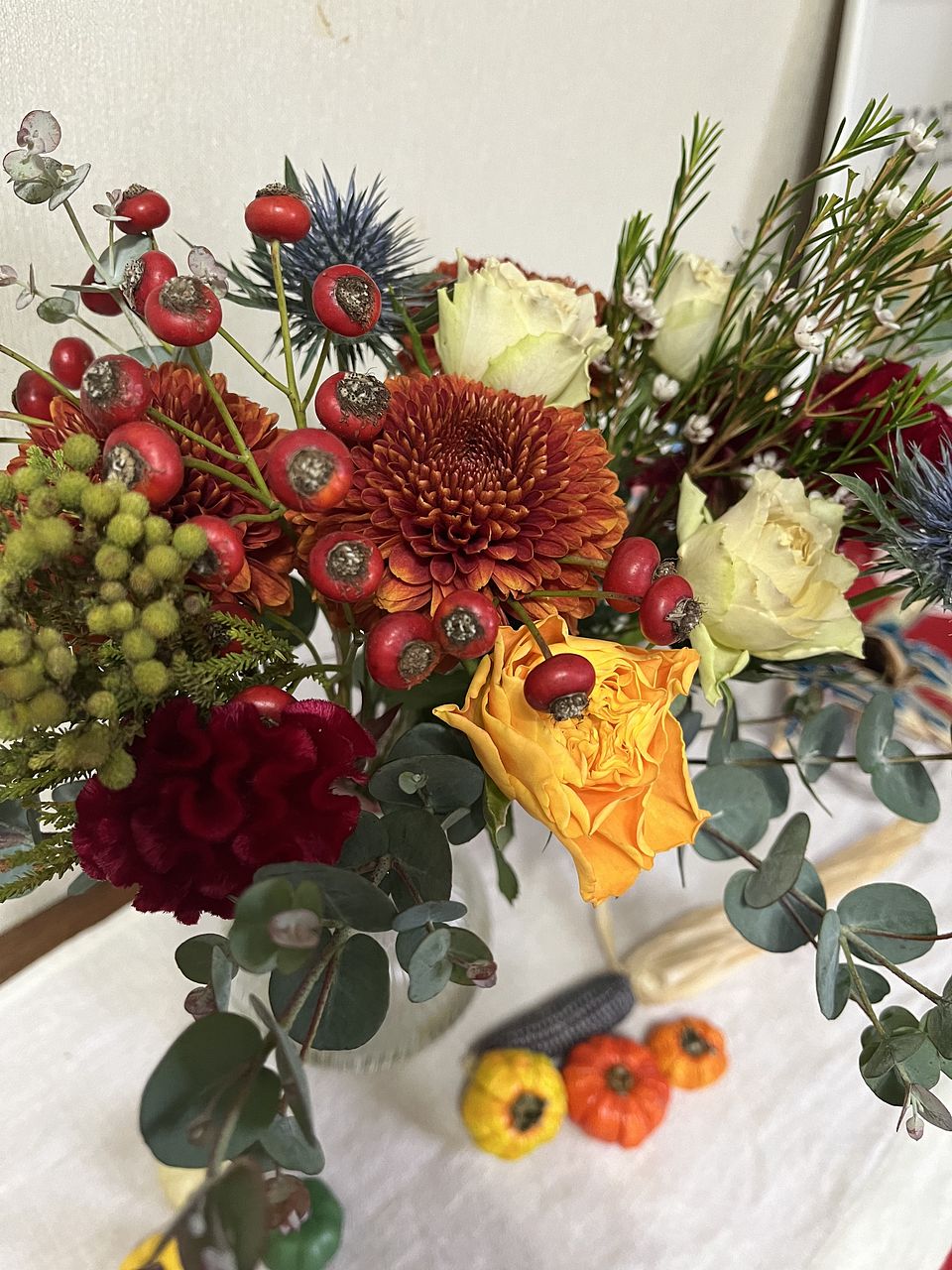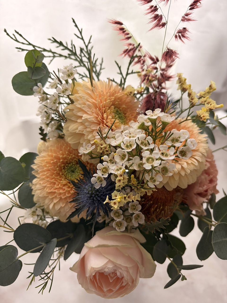 やっと念願のayaさんのブーケを購入でき嬉しい!グリーンの使い方がとても素敵。丸い葉のユーカリなど、普段見る事があまりない花材の組み合わせが素敵。だけど、タイミング的にクールの配送じゃなくなって、心配してたら案の定、まる2日かかりで届いたお花は、小さなお花はパラパラと落ちて、少しカラカラ気味、トルコキキョウや、カーネーション?のピンクのお花は全て薄茶に変色してしまっていました。配送中の、2日間は30度に近い気温だったので、残念でした。なので、こちらの評価になりました。本格的に涼しくなったら、またお願いしたいと思います。