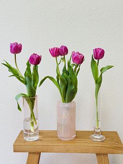 ピンクのチューリップの花言葉は「愛の芽生え」。ラフに飾るだけでおしゃれに。