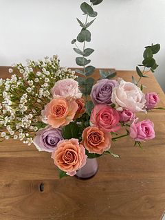 バラの品種はさまざま!イングリッシュローズをイメージしたふんわり優しいカラーのバラと季節の草花をたっぷり束ねてお届けします。
