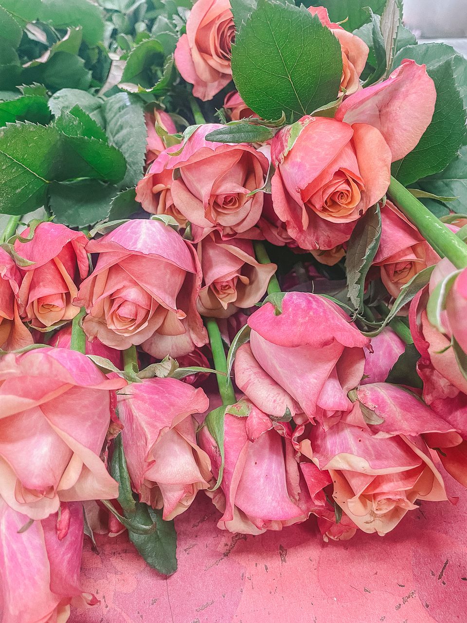 「ヴィンテージ」はアンティークピンクからオレンジ色のグラデーションがうつくしい品種。ベージュが強いものもあり、1本1本の表情の違いが楽しめるばらです。「ラブロ」は波打つ花びらがキュート😍 花弁の外側がブラウンを帯びている花もあり、アンティークな雰囲気がおしゃれ。