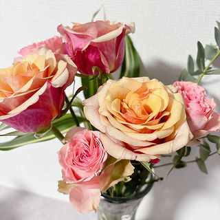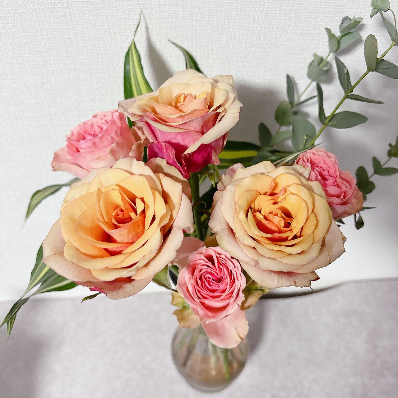 ヴィンテージがたまらなく可愛いです💓💓 外側はピンク、内側はオレンジのグラデーションでうっとりします😍 ラブロは今のところ普通のピンクのバラかな?という感じです。笑 (わたしはバラは長持ちさせるために葉っぱはほぼ落としてしまうので、寂しくならないように家にあったグリーンを一緒に飾ってみました!)