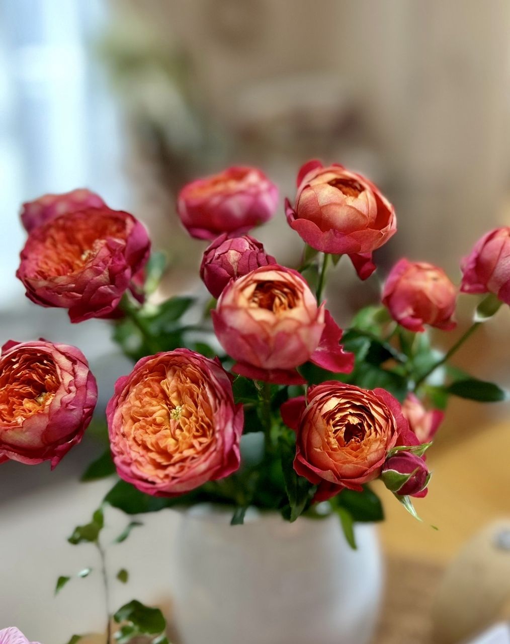 鮮やかなコーラルピンクからオレンジ色のグラデーションが美しい。まるでりんごのような秋らしいカラーのフローリストいちおしのばらです🍎🍁