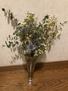 エリンジウムや針葉樹のブルーアイス、野バラの実を組み合わせて。ドライに向いてるお花をセレクトしています。
