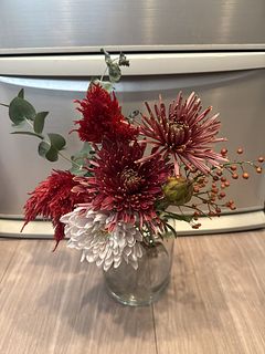 印象的なアンティークレッドのマム「トゥーラカメーラ」やふわっとした「セイオペラピンク」、ちょっと珍しい「ドリアチェリー」などをたっぷりと束ねました🍒