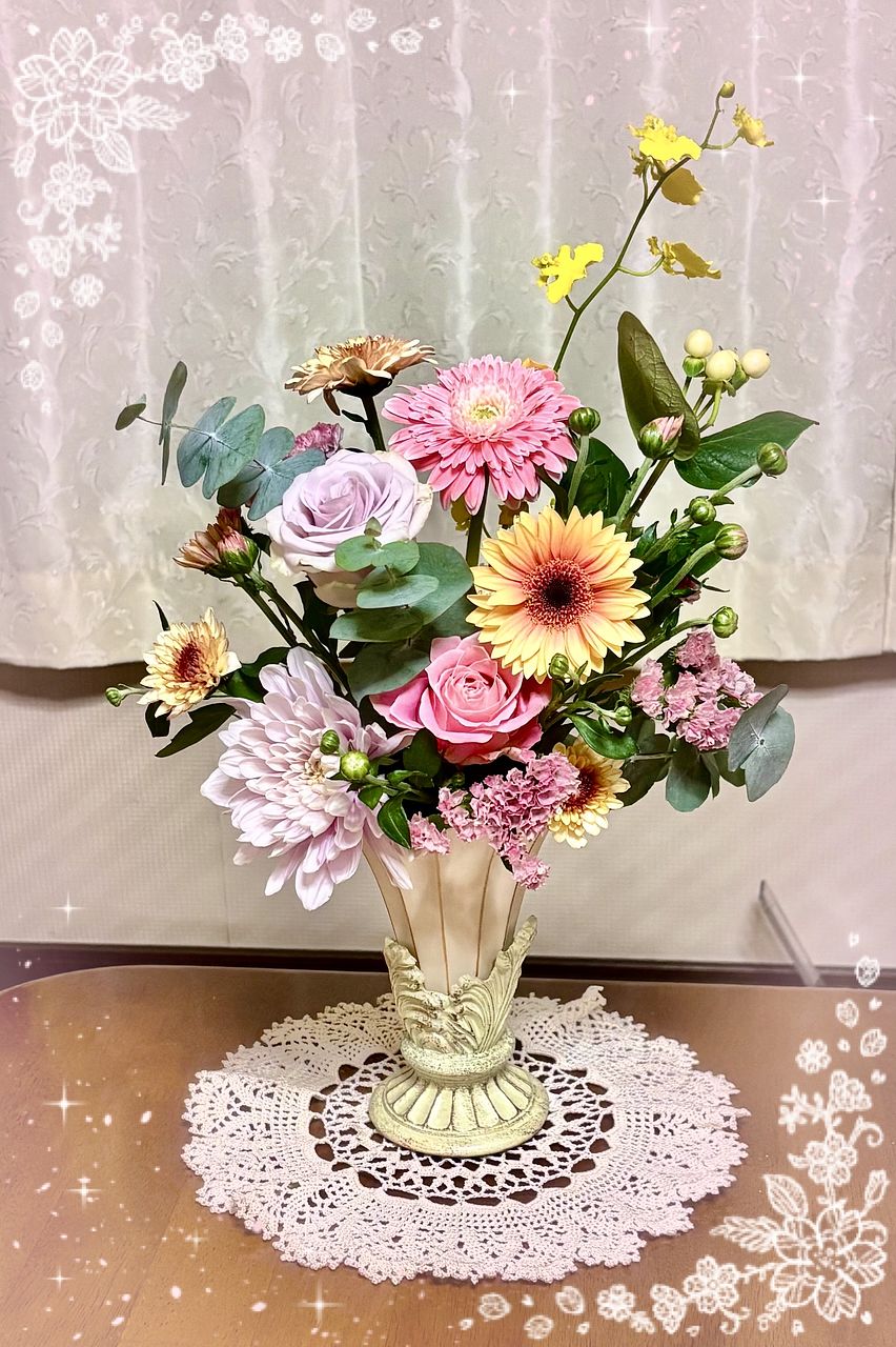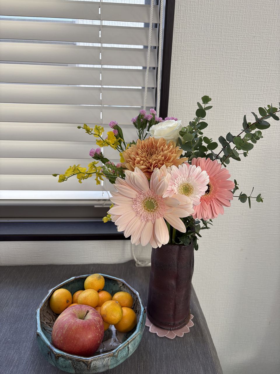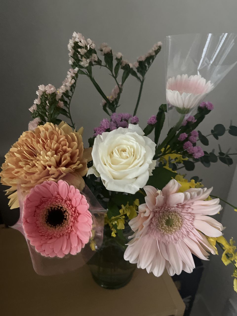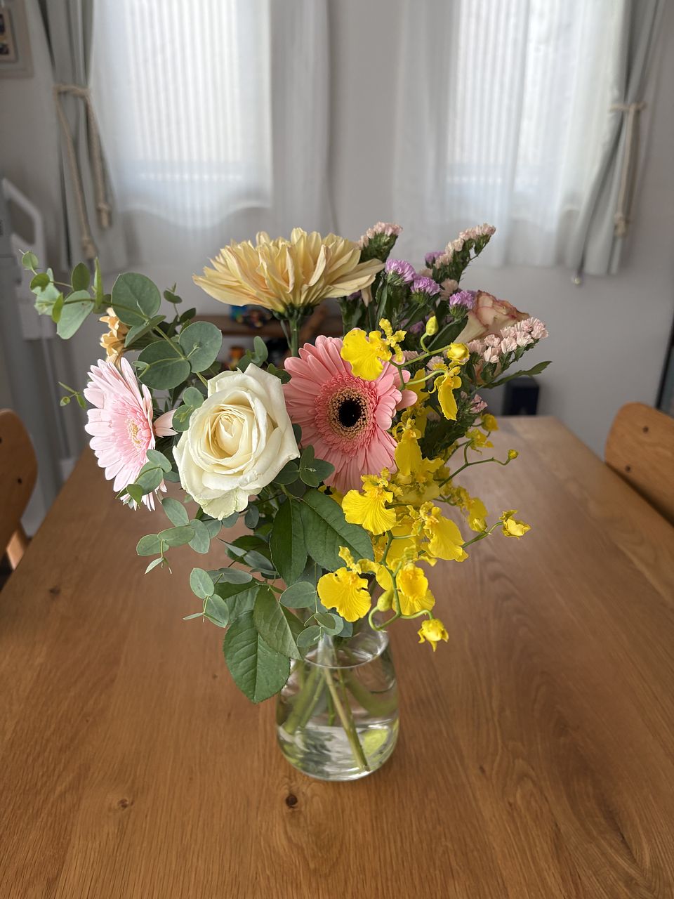 色々なお花が入ってました〜ただ、私のスキルがなく、ただ花瓶に刺すだけで、可愛さを出せてません😢