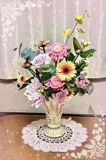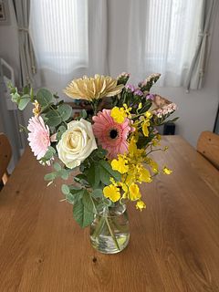 マムとガーベラが大きくてとてもキレイです。 バラが1本だけだったので、少しガッカリ。 オンシジウムとスターチスがポロポロ落ちるのと、ユーカリの下の方の葉が枯れそうになってました。 全体的にキレイなのですが、思ったより少し寂しかったかな。お誕生月のご褒美だったので…