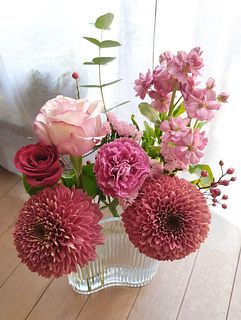 赤く色づくバラの実やマム。レッドからアンティークピンクのお花を集めました。