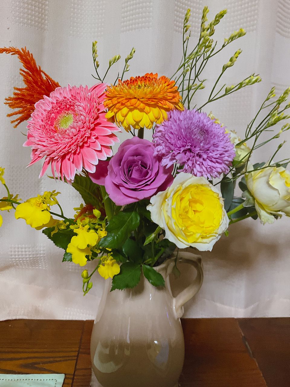 バラの花言葉は「感謝」「上品」、オンシジウムの花言葉は「祈り」、ガーベラの花言葉は「希望」「前向き」「常に前進」「美しさ」、マムの花言葉は「清らかな愛」「高潔」など。
