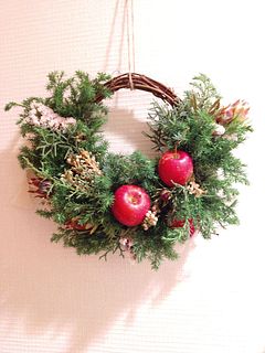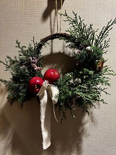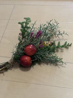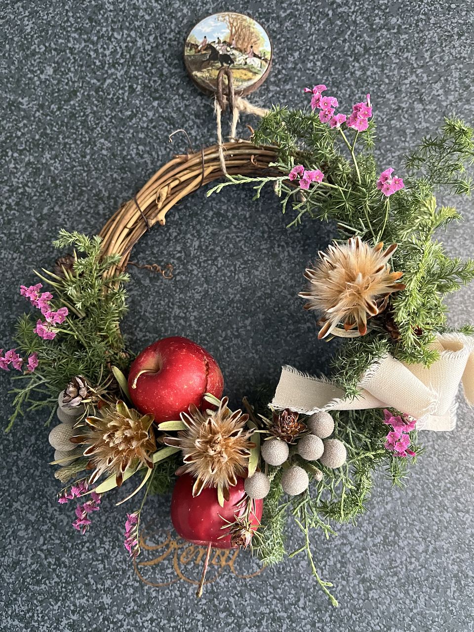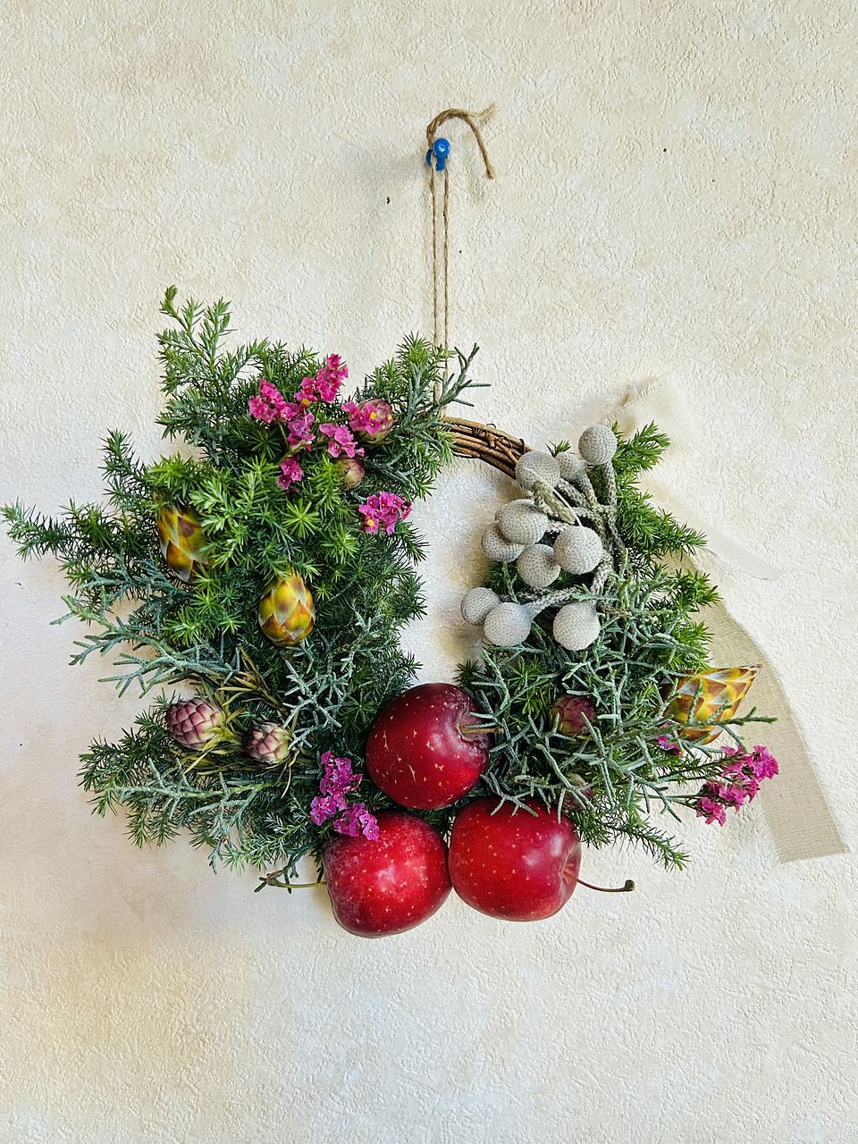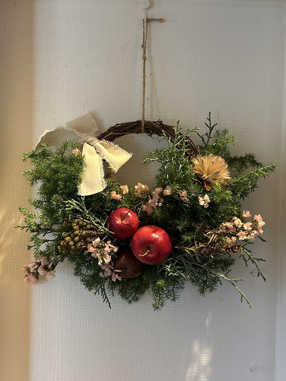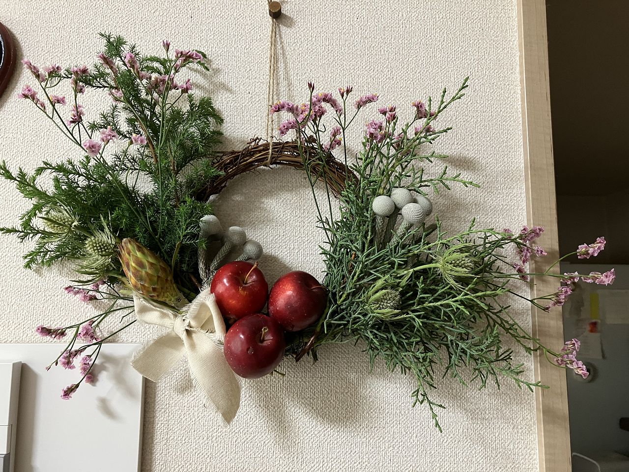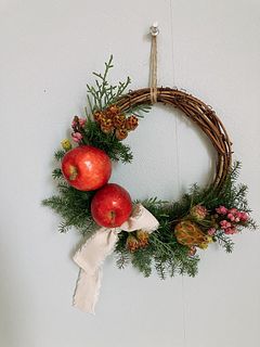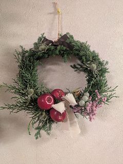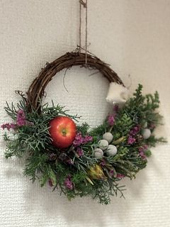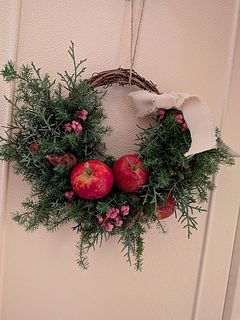 そのまま飾ってもかわいいですがせっかくなのでリースを楽しく作成させていただきました!途中から花材の向きを変えるのにボリューム調整が難しくもう少し作成の方法やコツの説明書きがあればよりありがたかったです!リンゴはとても可愛かったですがら1つはふにゃふにゃで傷んで居たので付けることは出来なかったのは残念でした。