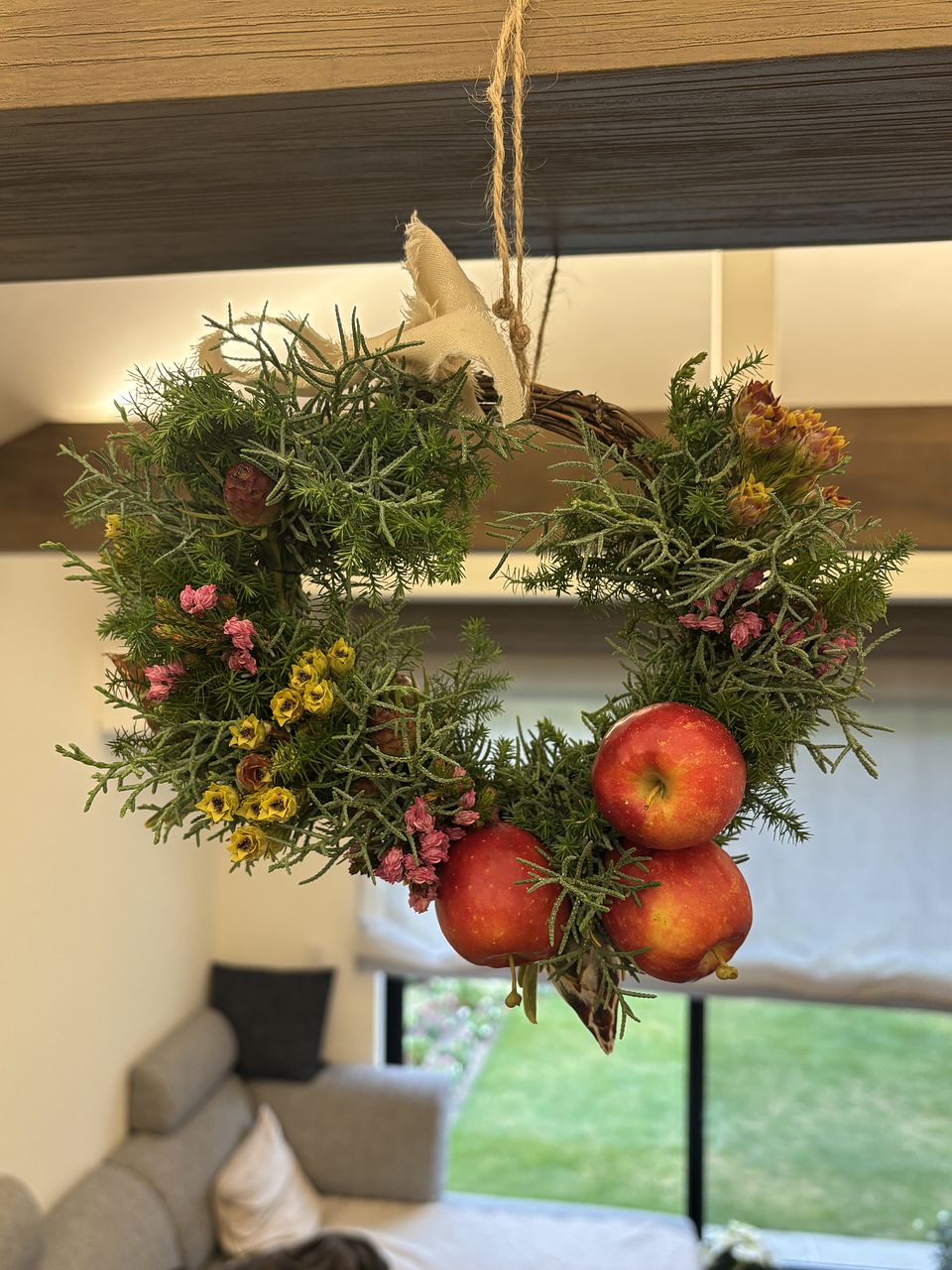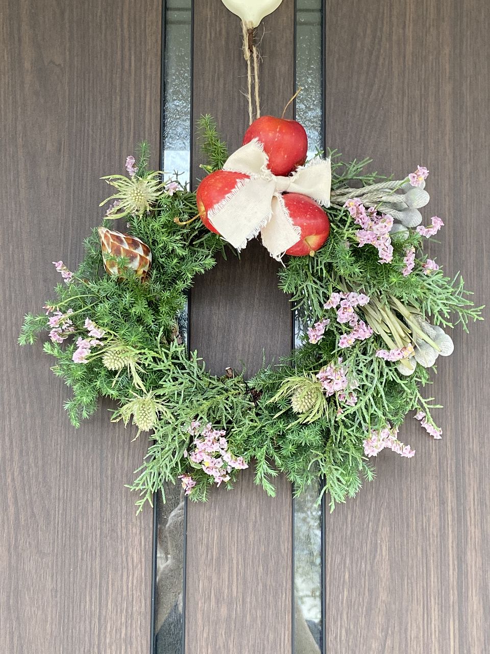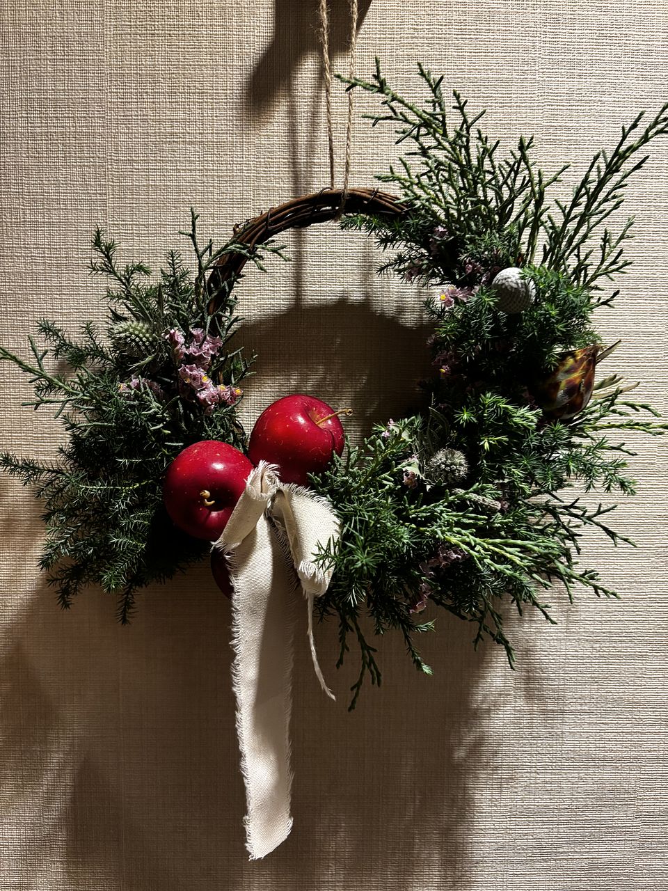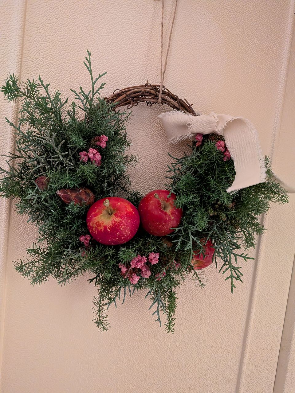 ボリュームたっぷりなリースになりました。作っている時は森林浴しているような良い香りに包まれて、癒されました😊生のリンゴの扱いが難しかったですが、何とかカタチになったような💦このリンゴ…腐ったりしないのか不安ですが🍎どうなんでしょうか😅
