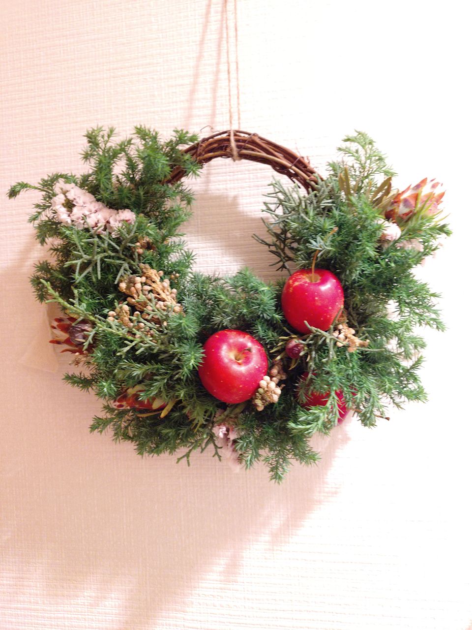 リースは何度か作りましたがハーフは初めてなのでちょっと心配でしたがなんとか作る事ができました。見本とずいぶん違うけど自分では良くできたかな。りんごは2個ワイヤーを使いましたが、1つは爪楊枝を刺して付けてみました。ユーカリが入っていたら嬉しかったかな。