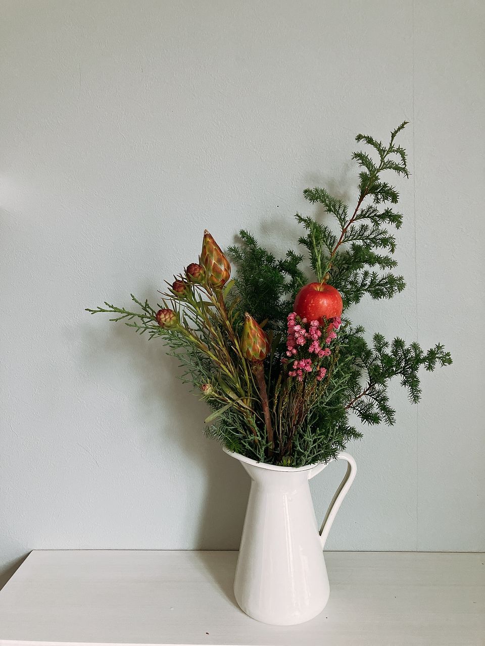 花材がとてもボリュームがありました。 朝届いて直ぐに作成。とても楽しいです☺ 家にあったタグをつけてみました。アレンジも楽しいです。 花材が余ったので家にあった唐辛子と小さなクリスマス飾りを作り花瓶にもさしました。