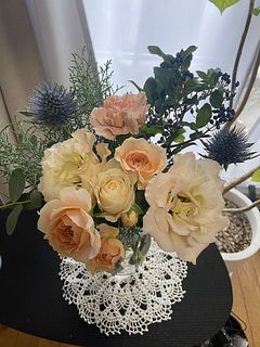 やわらかな光をまとったような、優しいベージュやアプリコットカラーのお花たちが集めて🇫🇮🪵北欧カラーをイメージしたお部屋に馴染みやすいホリデーブーケをご用意しました。