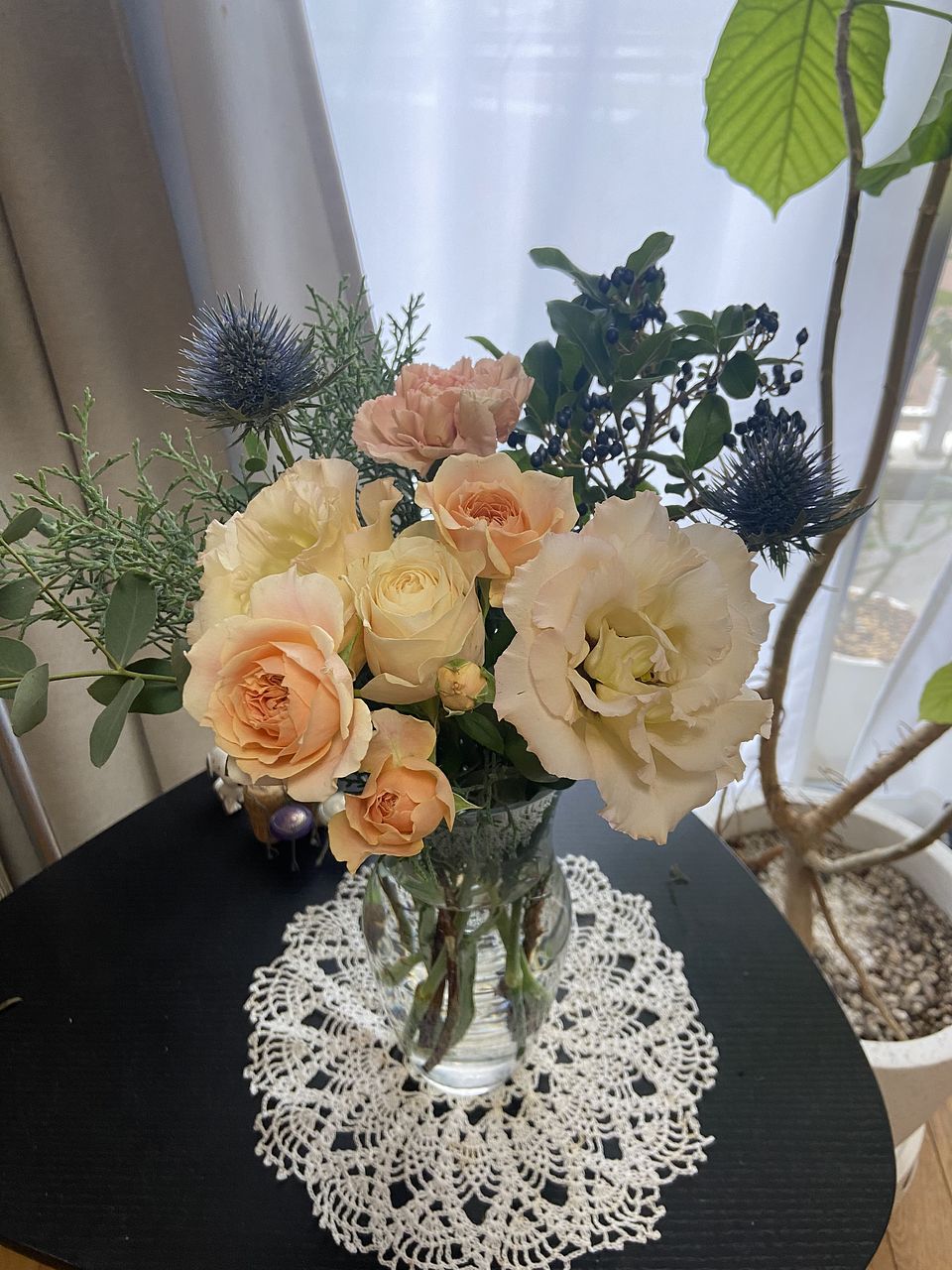 ふんわりとしたトルコキキョウやカーネーションに、ほんのりブルーの実やグリーンを合わせて、ナチュラルさをプラス。テーブルや玄関に飾るだけで、お部屋全体がパッと明るく、あたたかい雰囲気に包まれます🪟✨