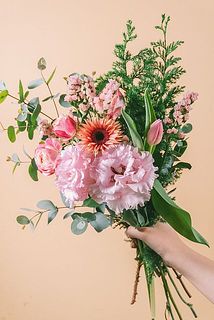 華やかなスプレーバラ「チアフル」、もこもこのトルコキキョウや早咲きのチューリップ、ガーベラなどピンク、コーラルレッドのお花とグリーンをたっぷりと!