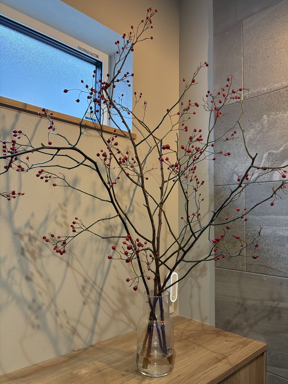 実が落ちていることもなく、とても元気な野バラが届きました。長さも枝ぶりもよく、玄関が華やかになりました。クリスマスが近くなったらオーナメントを少し足して飾りたいと思います♪