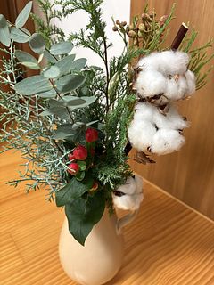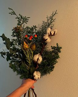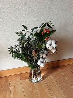 ドライにするか迷いましたが一回花瓶にいけました。綿帽子の飾りが難しいく一個カットしましたがちょっと失敗してしまいました。赤色の実が数個しかなくもう少しあるといいなあーと思いました。このお値段で送料込みではかなりお買い得です!またクリスマスや年末年始のお飾りを購入したいです。