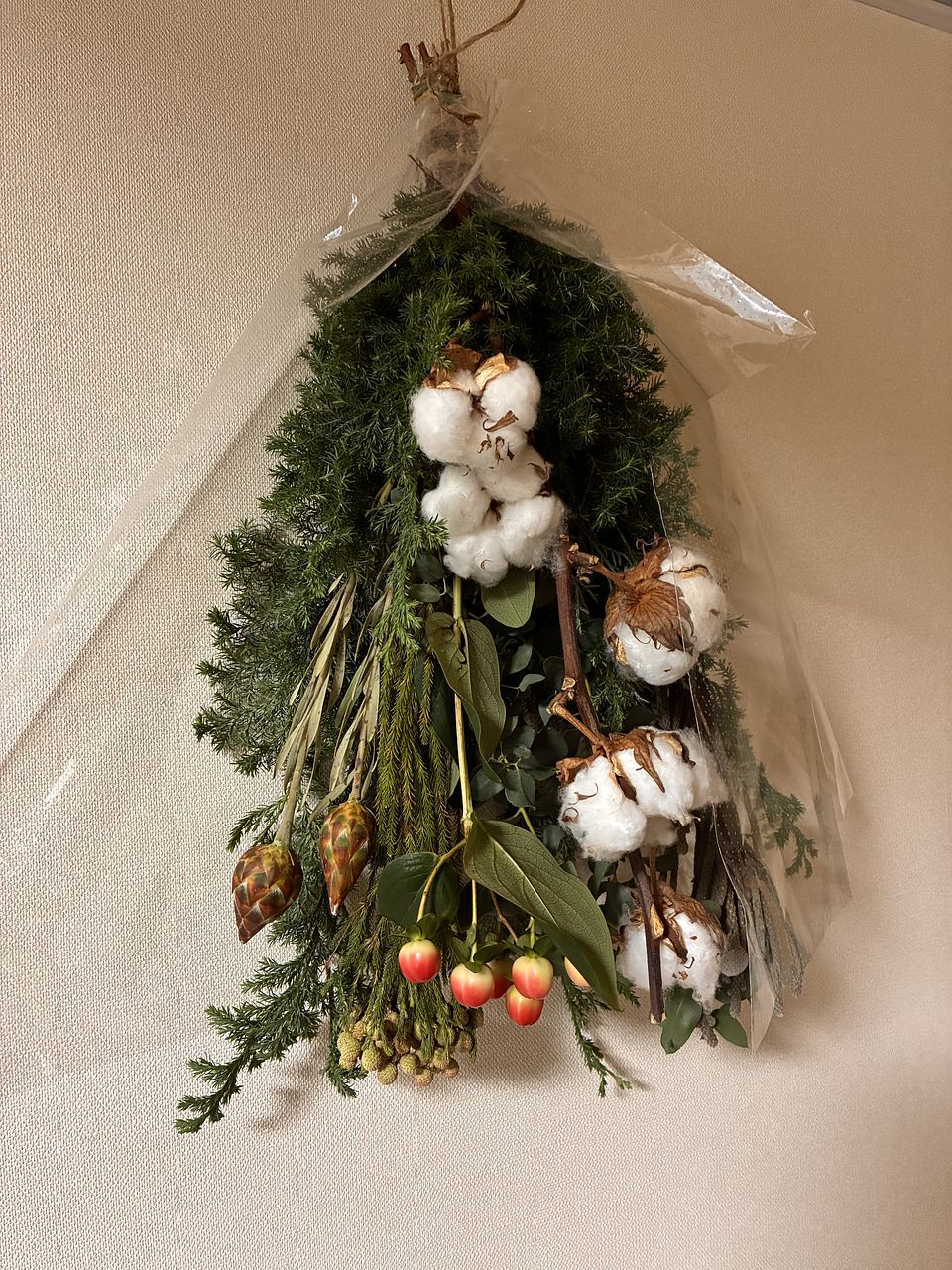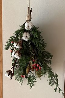予想してた以上のボリュームで大満足!大きな綿もたくさんついててカワイイです。クリスマスシーズンまで楽しみたいので早速ドライにしようと吊るしました。スギのフレッシュな良い香りに癒されます。