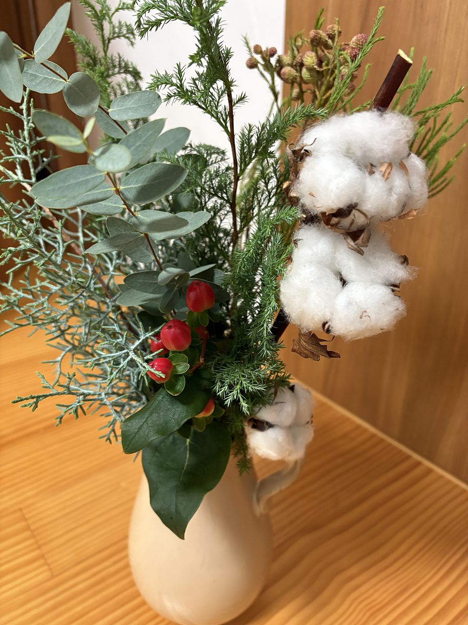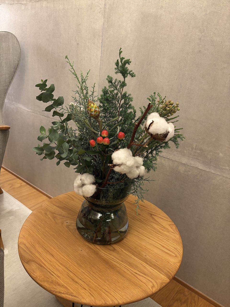 一気に部屋にクリスマス気分が訪れました!赤い実がポイントなのにヒペリカムが一つ折れていて残念でした。😢明日スワッグにしようかと思っています