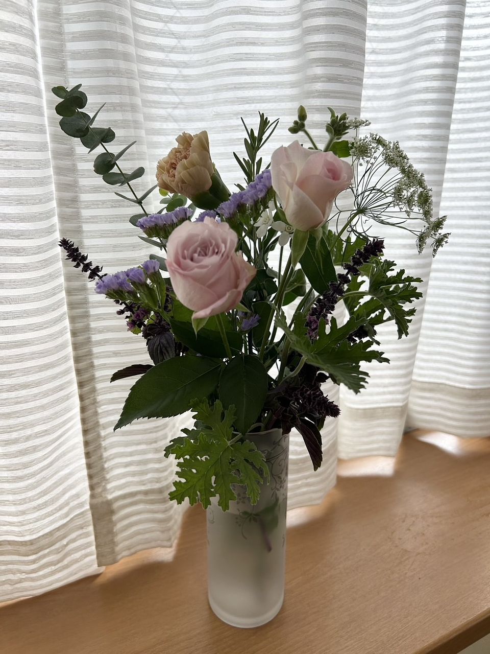 水揚げが上手くいき、3日経って花がだいぶ開きました。花はバラ2本とカーネーション1本と少ないですが、このブーケのメインであるハーブが沢山入っていたので満足です。皆さんの投稿写真が参考になるので助かります。