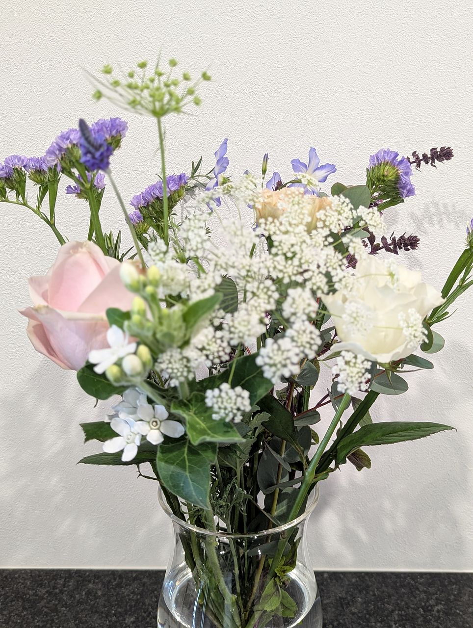 ▼届いたブーケのレシピ💐(推測):カーネーション/スターチス/レースフラワー/バラ/ホワイトスター/ユーカリ/ゼラニウム/ブプレリウム/バジル/ローズマリー/ミント