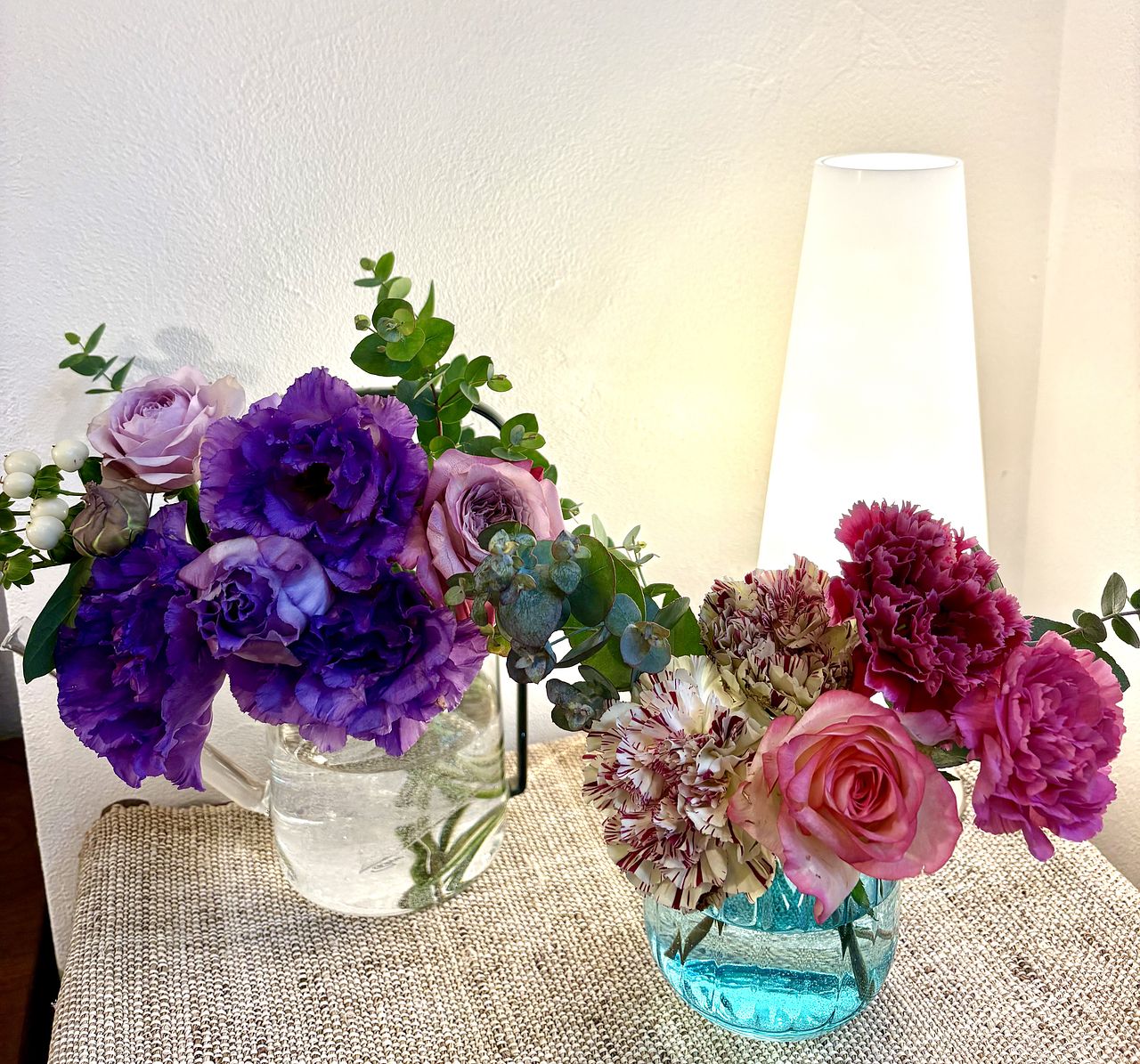 ラベンダーカラーのトルコキキョウにアンティークカラーのバラをたっぷりと束ねました😌