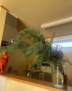 ボリュームに驚き、香りに癒されました。 2日間くらいは香りが強く感じ、少し鼻がムズムズしていましたが、その後は落ち着いて、ふと感じるくらいになっています♪ 花瓶の水を多めにしないと重さで倒れそうです。 だいぶ下枝処理をしました。 緑色が優しく、穏やかなイメージです💚