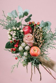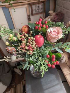 バラ / ヒペリカム / バーゼリア / リンゴ / リューカデンドロン / ユーカリ / ブルーアイス など(一部サブ花材の変更がある可能性も)