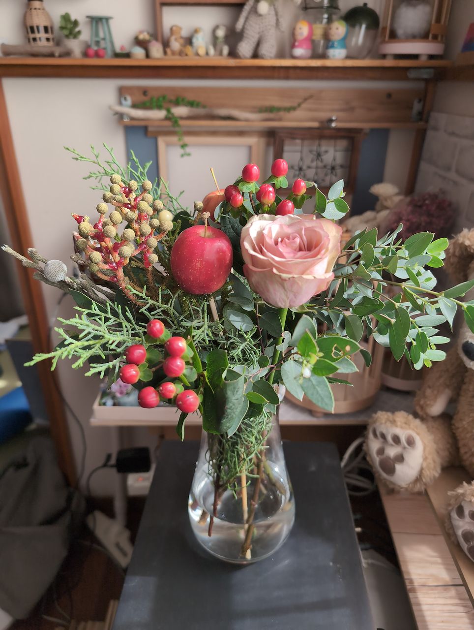 つやっとしたリンゴ🍎と赤や白の実ものがツリーのオーナメントのようなスワッグはいかが?🎄