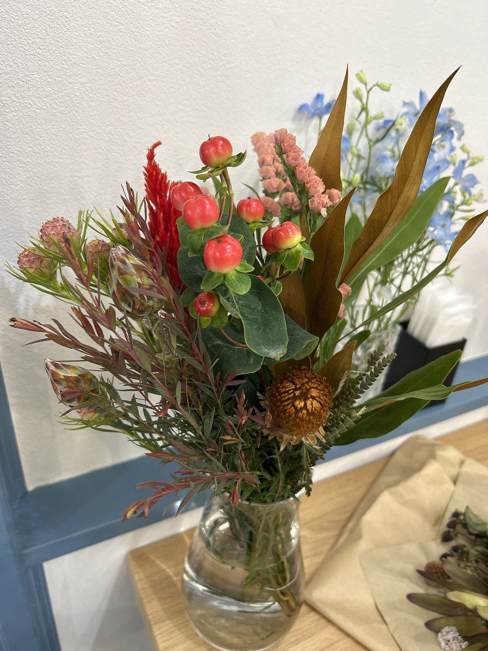 可愛くて 葉物も 素敵です 自分では 選ばないお花で嬉しいです 水あげしても 細い葉の枝だけは しおれてます