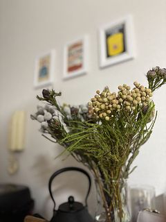木の実のようなネイティブフラワーを中心に束ねることで、ナチュラルで落ち着いた雰囲気に。
