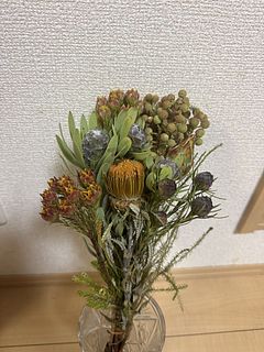 お花の状態は良かったです。 ただ仕方ないのですが、ブルニアが入っていなかったのでちょっぴり残念でした。サンプル写真をどうしても期待してしまうので… 同じ植物が2本ずつ入っていたので、ドライフラワーにもしてみました。 お花自体はかわいいです😊