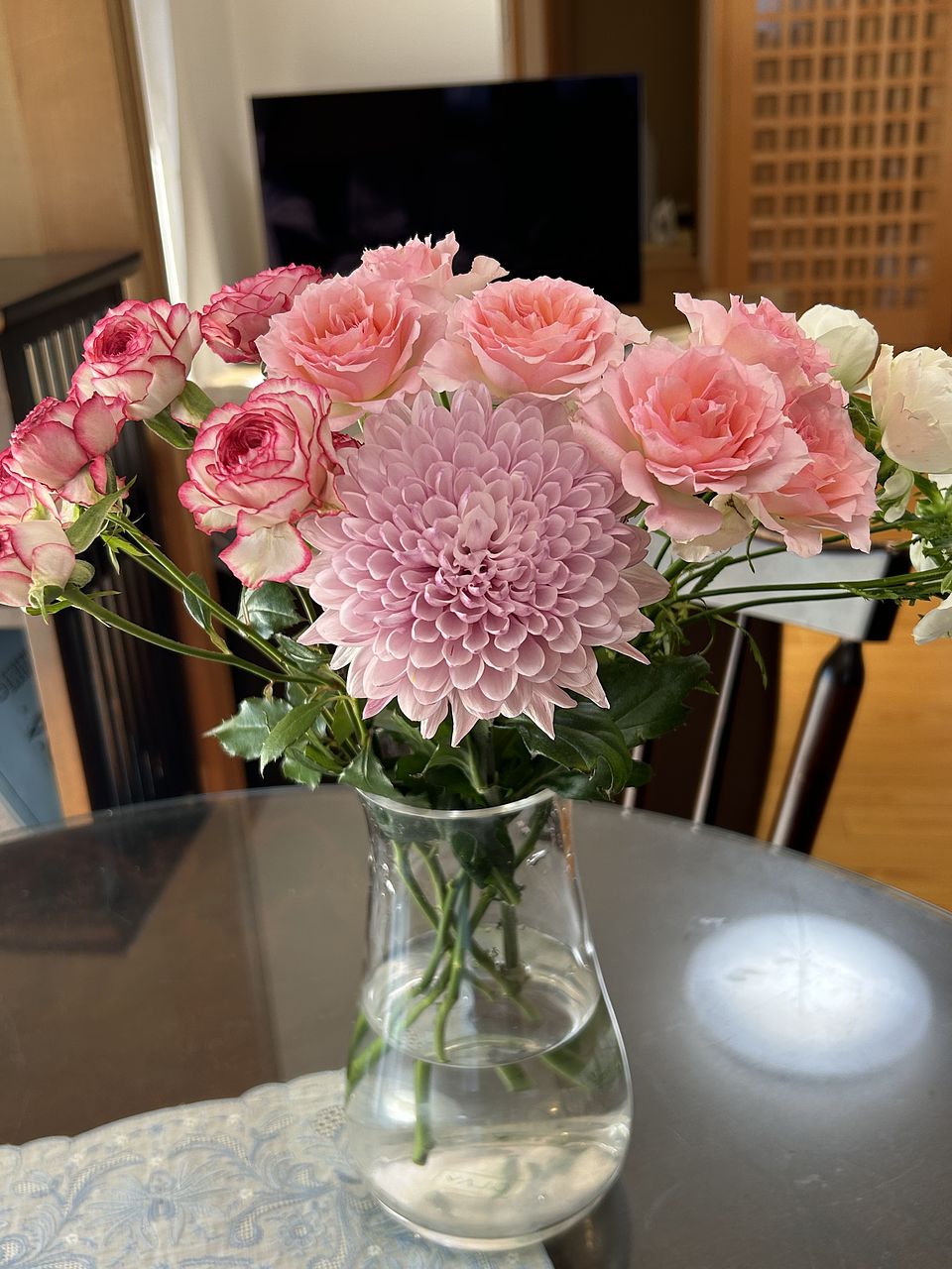 小ぶりで可愛らしいお花が届きました。 ただ、白いスプレーバラが、一本完全にダメになっていました。 スプレーバラだけに、一本抜くだけで、ボリュームダウンです…。 生花なので、まあ、こういう時もあります…。 追記 他の花は、小ぶりですが、元気に咲いています。 あわせた菊は、10日ほど前に届いたものがまだ元気に咲いてくれています。