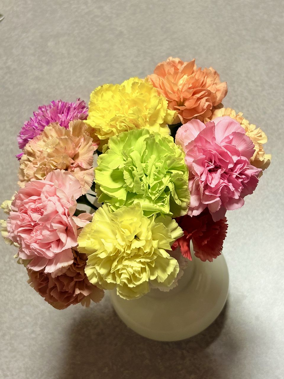 フリルのような花びらのカーネーションをたっぷり楽しみたいあなたへ。ピンク系とオレンジ、イエロー、グリーン系のアソートを2束期間限定10%OFFで🩷🍊