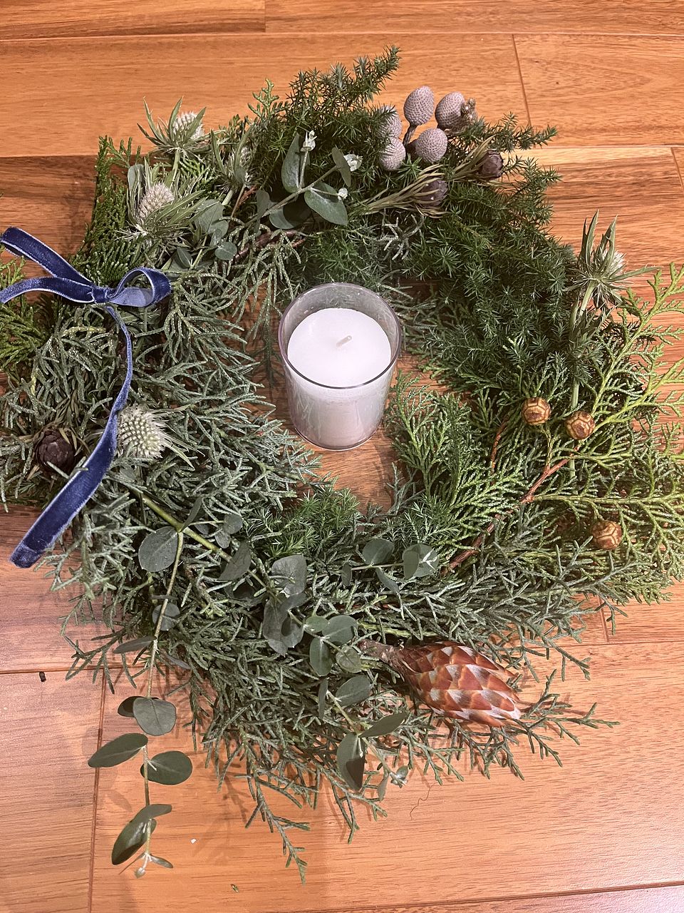 中央にはキャンドルを。火を灯せばやさしい光がリースのグリーンを照らして、まるで森の中の小さな灯りのよう🕯️🧚