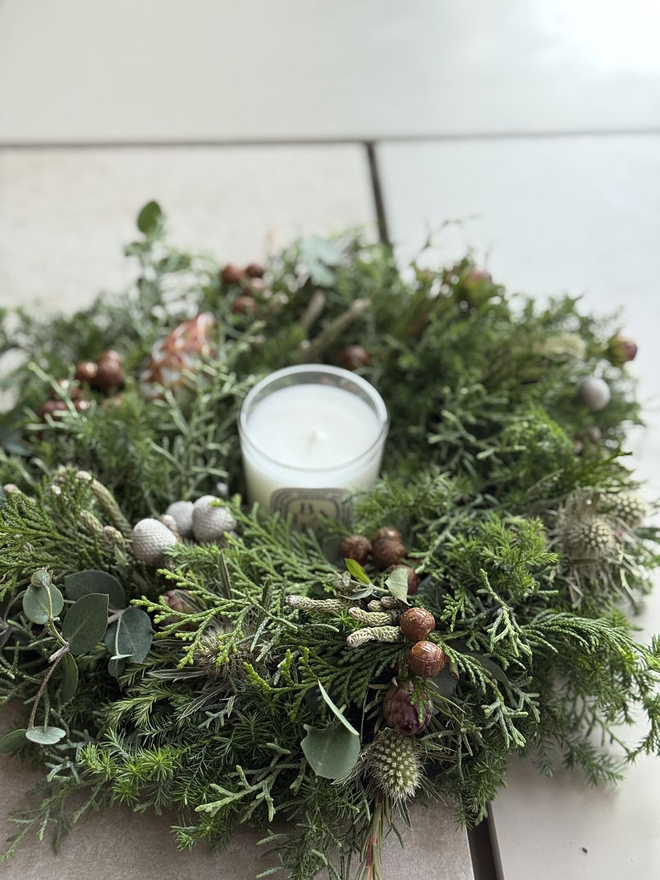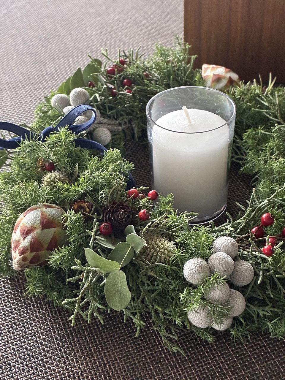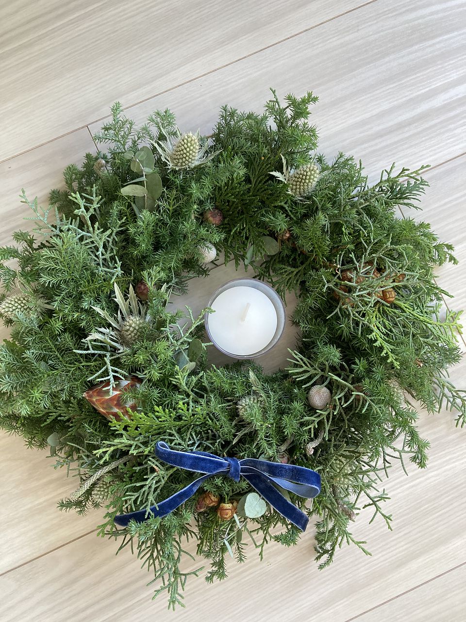 いつもリースの花材たっぷりで可愛らしいリースが作れるので今回も可愛くできました!ヒバやスギのいい香りが癒されます🎄 出来上がりは直径25センチでした。 アレンジで、ハロウィンの時の余ってた実もドライにしてたので一緒に入れたらよりクリスマスっぽくなって満足です🥰 キャンドル1個入れるにはぶかぶかに作っちゃったので、家にあったキャンドルを寄せ集めましたがいい感じです🕯🌟 花材は少し余るのでスワッグや香りを楽しむために花瓶に入れておくと良いです🙆♀️