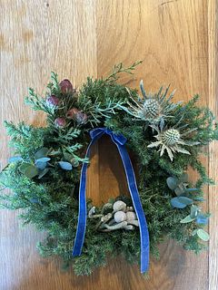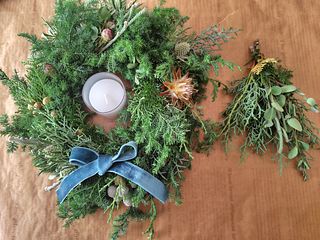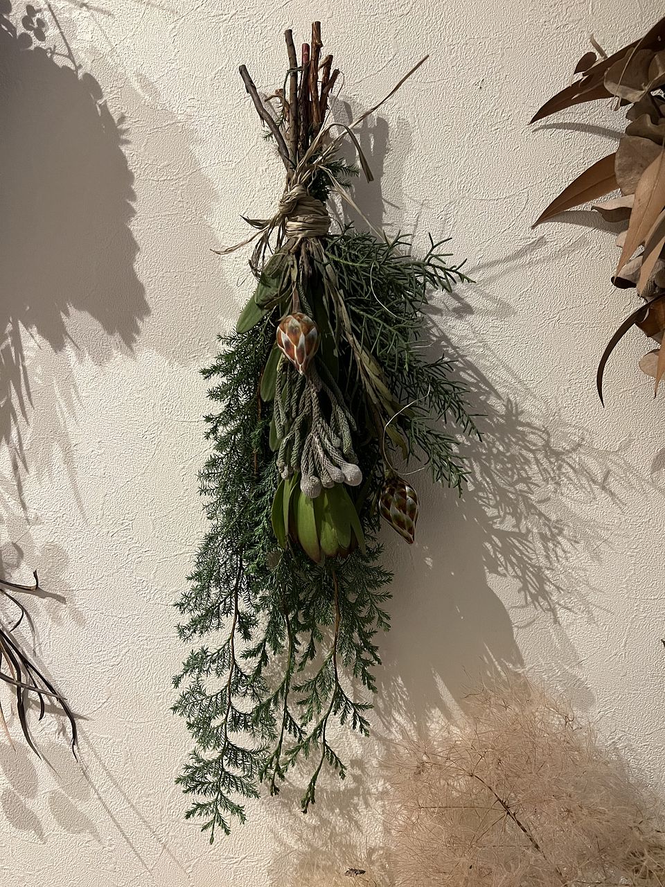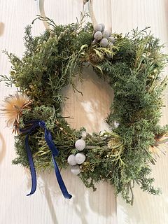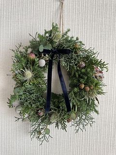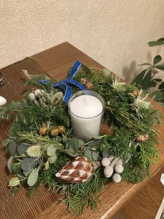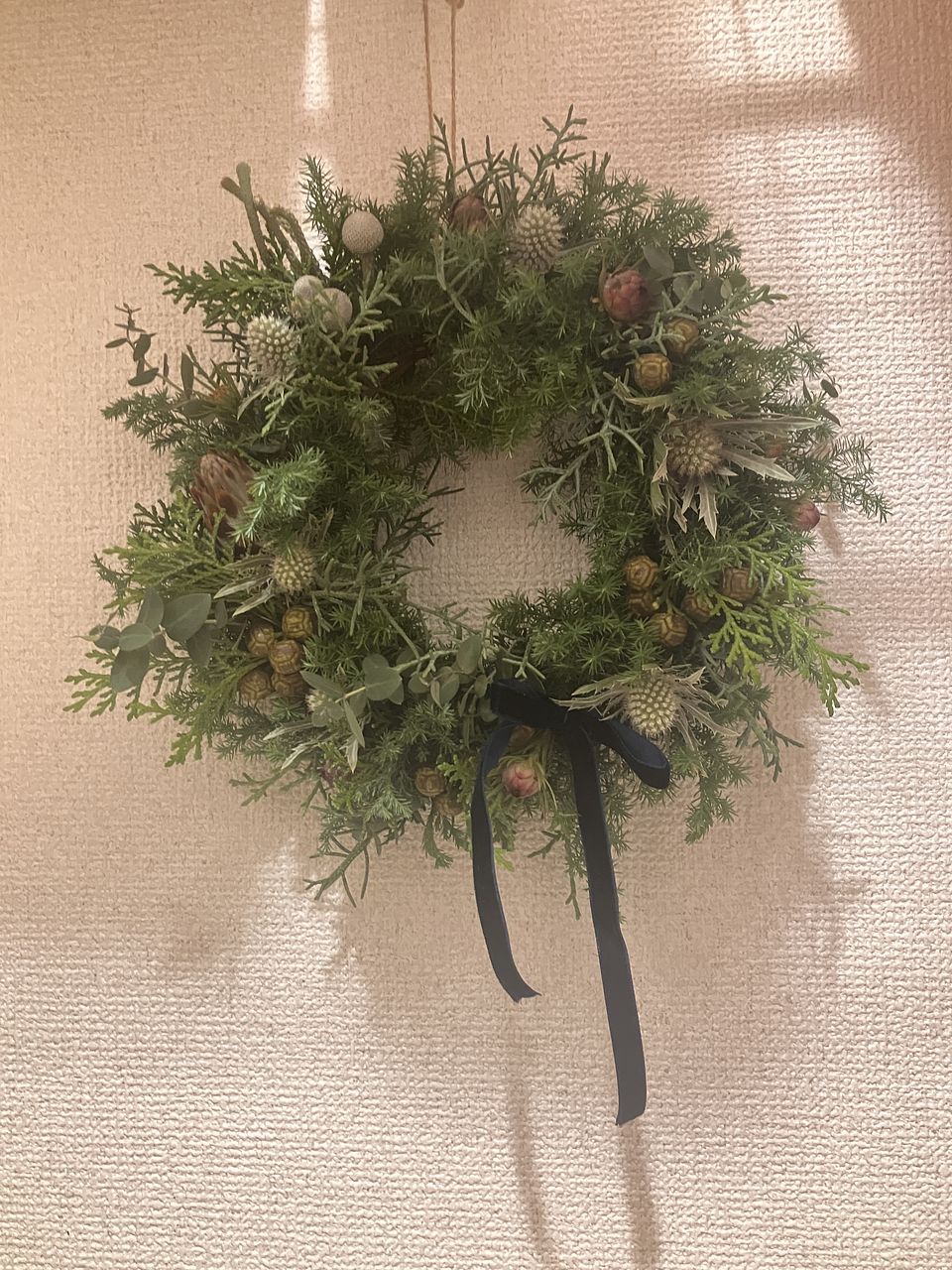 思っていたよりリースの土台自体は小さめでしたが、使いきれない程の花材がきて、大満足でした。 リースの作り方はオンラインで動画などを参考にして作りました。何となくそれっぽくなったので、良しとします。また余った花材で、またもや何となくスワッグ的なものも出来たので、すごくお得感がありますね。 少し早いですが、クリスマスの香りを堪能します!