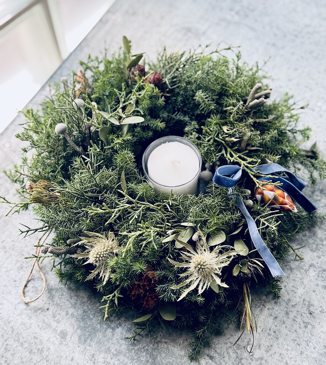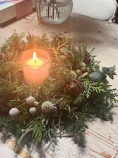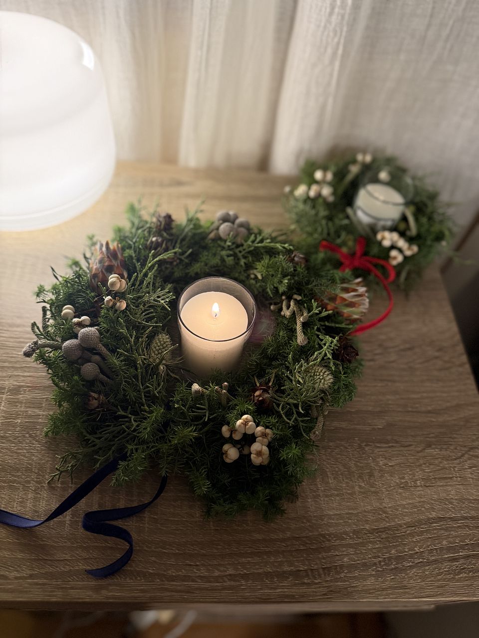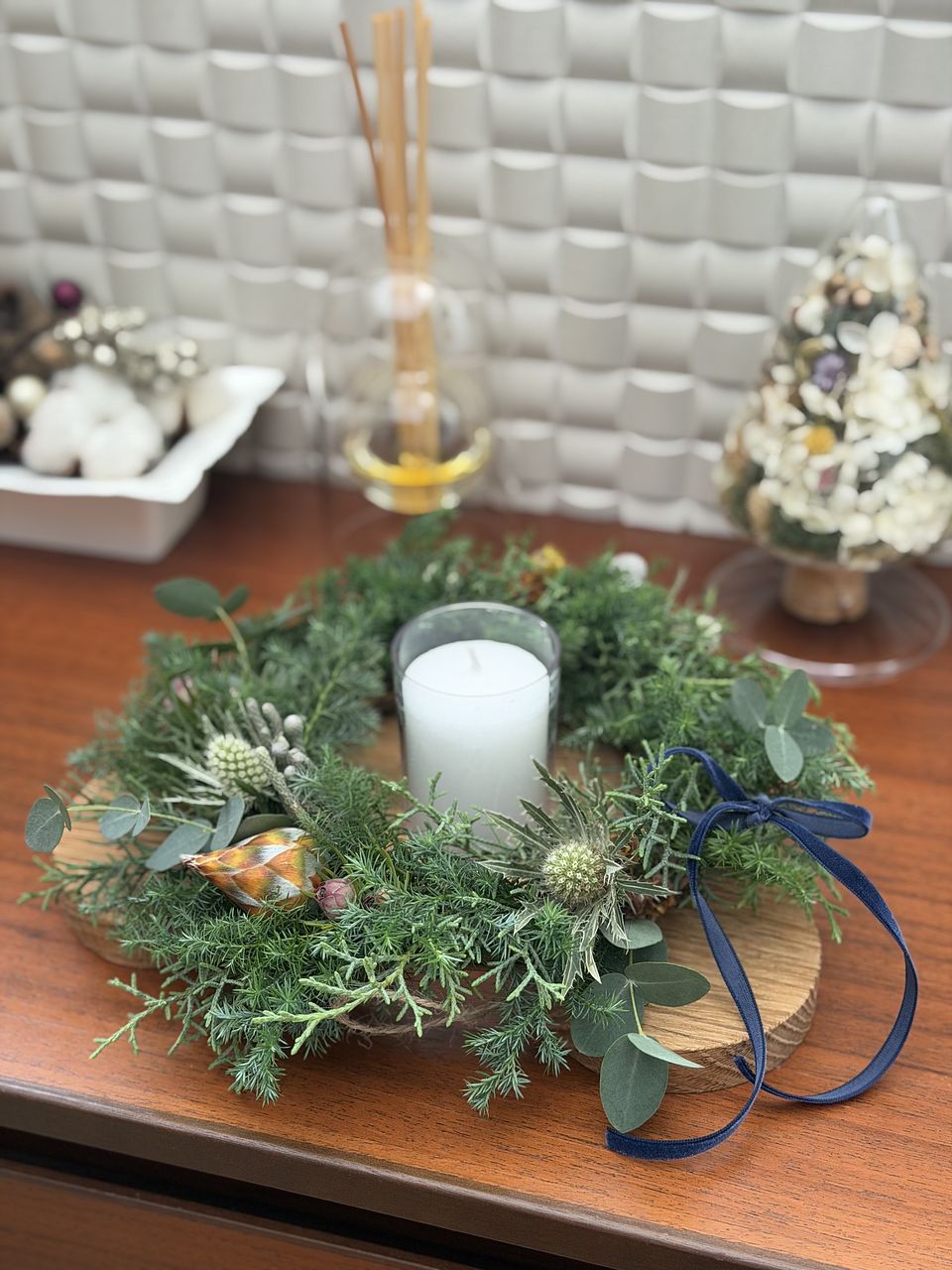 グリーンとお花と実?のバランス&色がとてもおしゃれで、さすがだなぁと思いました。 自分では揃えられないですし、その上リース枠とワイヤーにリボンとキャンドル付きなんて🤩 来月クリスマス用もぜひお願いします!