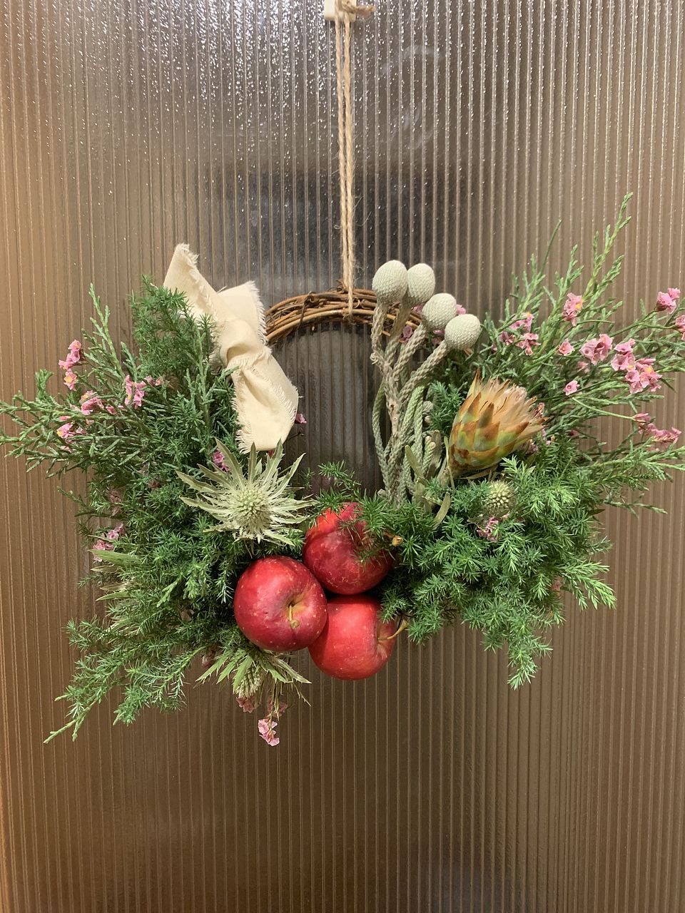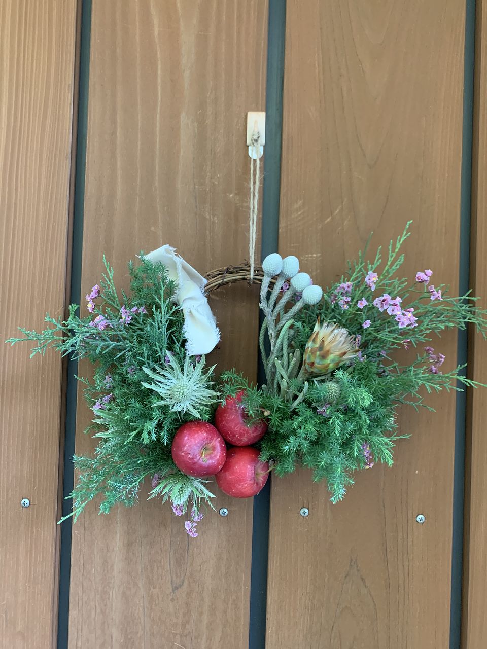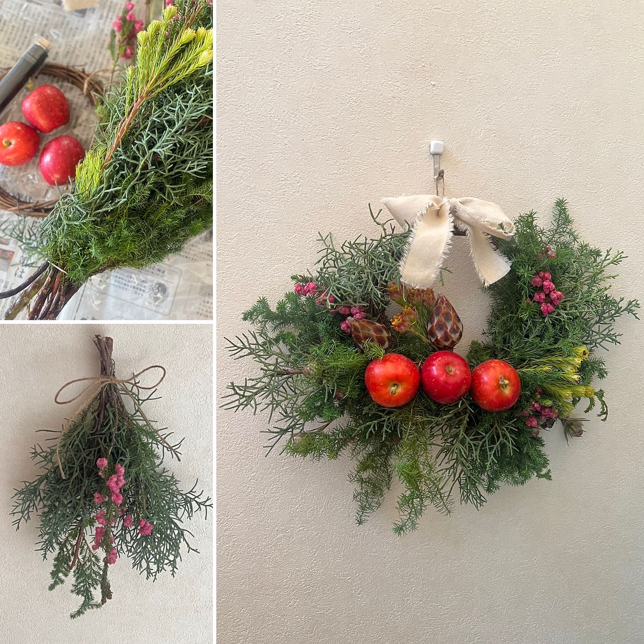 ボリュームたっぷりなリースになりました。作っている時は森林浴しているような良い香りに包まれて、癒されました😊生のリンゴの扱いが難しかったですが、何とかカタチになったような💦このリンゴ…腐ったりしないのか不安ですが🍎どうなんでしょうか😅