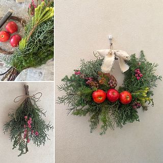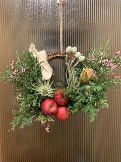 そのまま飾ってもかわいいですがせっかくなのでリースを楽しく作成させていただきました!途中から花材の向きを変えるのにボリューム調整が難しくもう少し作成の方法やコツの説明書きがあればよりありがたかったです!リンゴはとても可愛かったですがら1つはふにゃふにゃで傷んで居たので付けることは出来なかったのは残念でした。