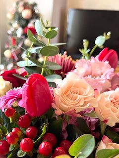 スパイラルに組まれていて葉の処理もしてあるのでそのまま飾って楽しめます。たっぷり入っているので華やかです。内容は毎回おまかせですが、色の雰囲気は同じ雰囲気でお届け予定です。お楽しみに!