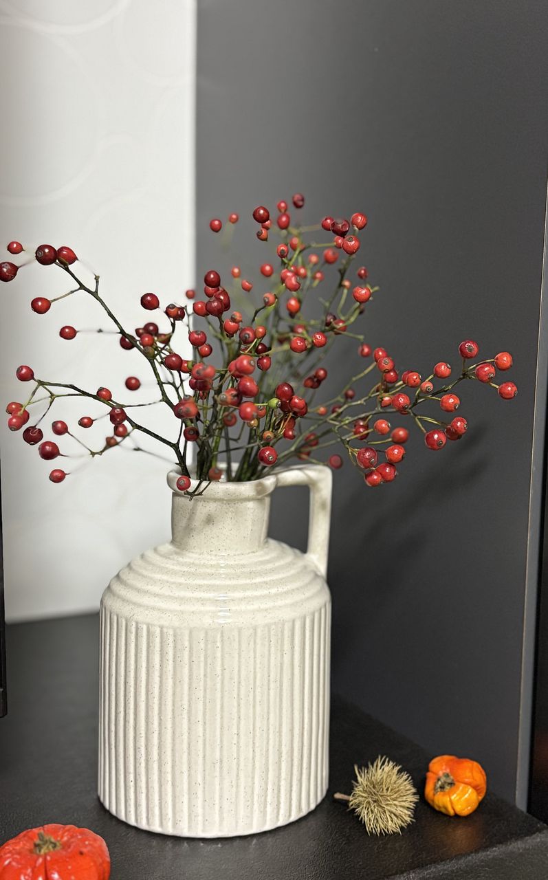 小さくて愛らしい野バラの実だけを束ねて。ばさっとラフに飾るのがおすすめ。